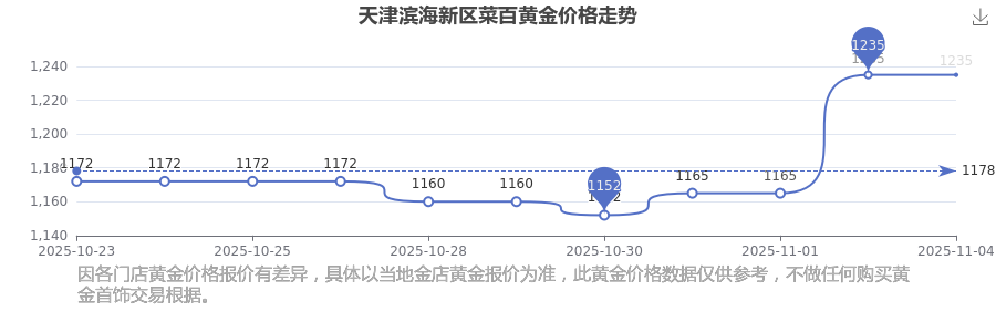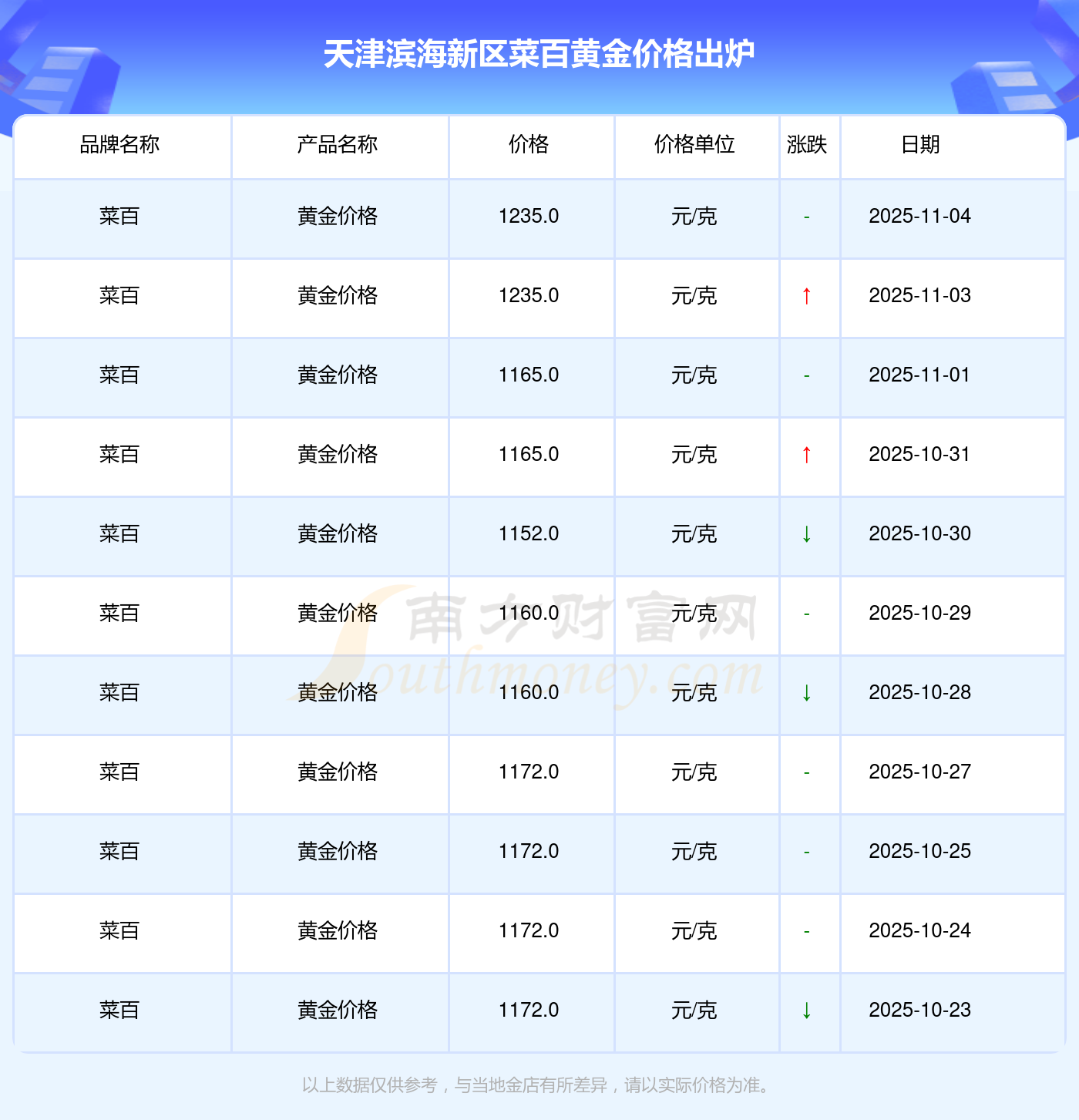 今日(2025年11月4日),1235.0元/克是天津滨海新区菜百黄金价格的价格标准。