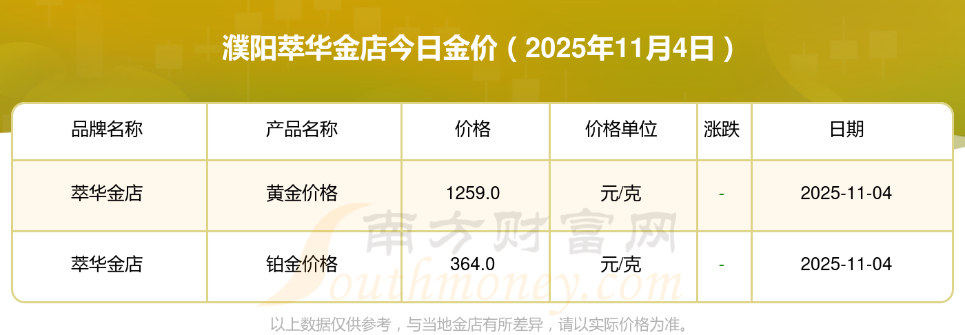 想了解今日黄金价格,现在每克黄金的价格是多少呢?2025年11月4日濮阳萃华金店黄金按克计价,现在多少钱一克?黄金价格1265.0元/克,铂金价格633.0元/克,饰品金价(内地)1265.0元/克,黄金饰品(香港)44220.0,铂金价格(香港)18130.0,金条价格(香港)39890.0,金条金价(内地)1168.0元/克,黄金价格1262.0元/克,铂金价格560.0元/克,足金价格1262.0元/克,黄金价格1209.0元/克。