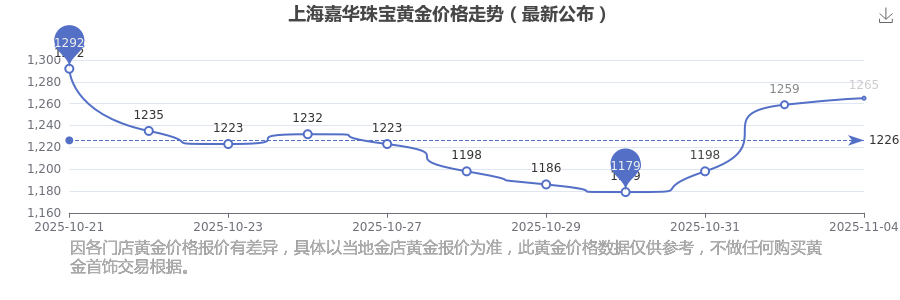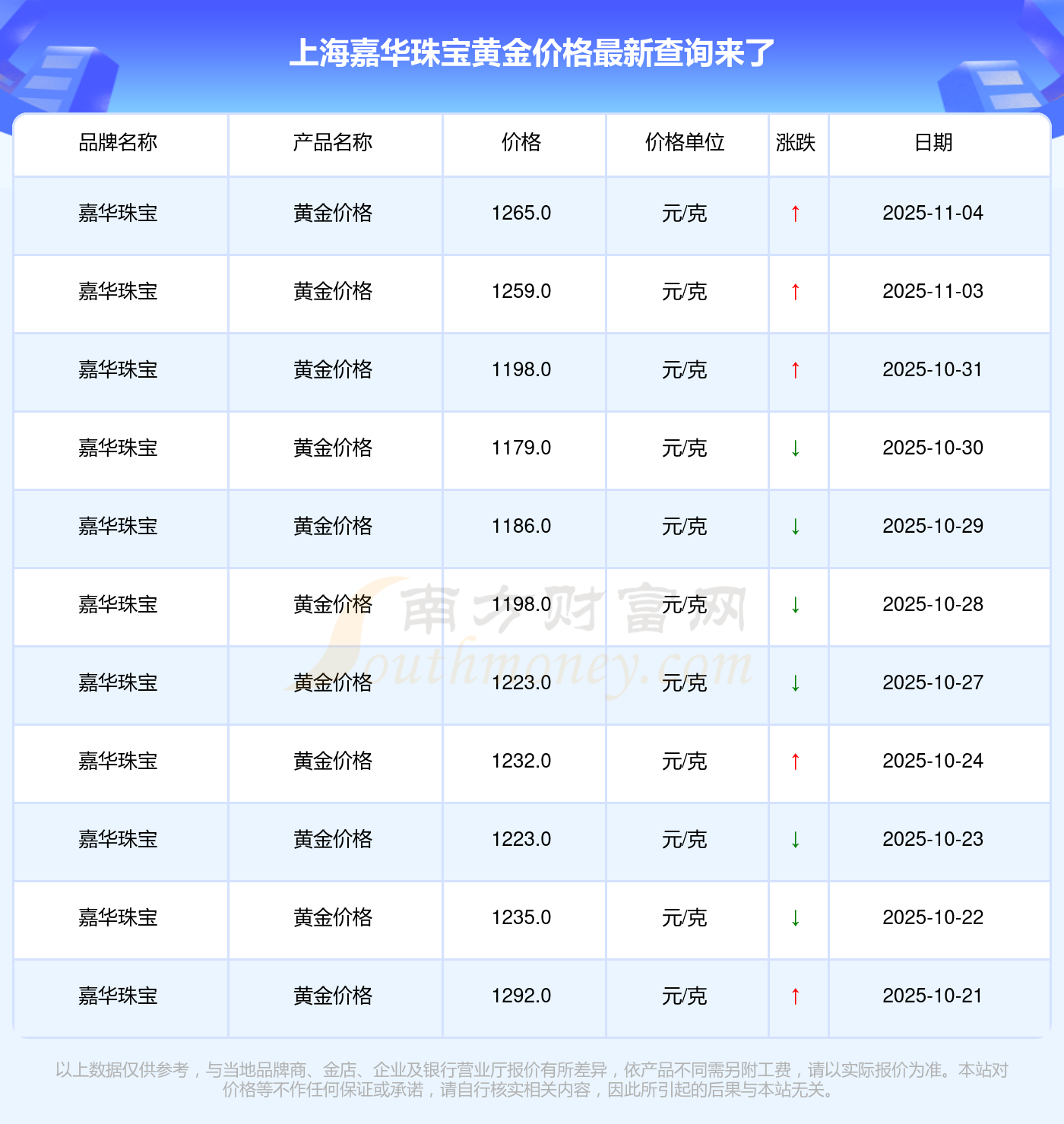 今日(2025年11月4日)上海嘉华珠宝黄金价格是1265.0元/克。