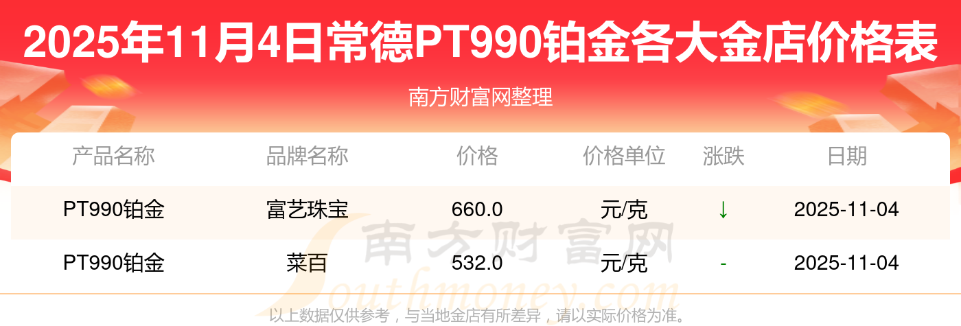 今日常德PT990铂金最高的金店是富艺珠宝,报价660.0元/克,PT990铂金最低的金店是菜百,报价532.0元/克。今日PT990铂金高低差为128元/克。