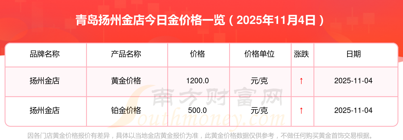 2025年11月4日青岛扬州金店现在黄金一克要多少钱:黄金价格1265.0元/克,铂金价格633.0元/克,饰品金价(内地)1265.0元/克,黄金饰品(香港)44220.0,铂金价格(香港)18130.0,金条价格(香港)39890.0,金条金价(内地)1168.0元/克,黄金价格1262.0元/克,铂金价格560.0元/克,足金价格1262.0元/克,黄金价格1209.0元/克。