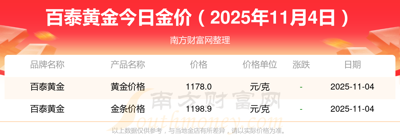 2025年11月4日周大福、周大福、周大福、周大福、周大福、周大福、周大福、老凤祥、老凤祥、老凤祥、周六福等各大金店品牌黄金价格最新价格如下:周大福黄金价格1265.0元/克,周大福铂金价格633.0元/克,周大福饰品金价(内地)1265.0元/克,周大福黄金饰品(香港)44220.0,周大福铂金价格(香港)18130.0,周大福金条价格(香港)39890.0,周大福金条金价(内地)1168.0元/克,老凤祥黄金价格1262.0元/克,老凤祥铂金价格560.0元/克,老凤祥足金价格1262.0元/克,周六福黄金价格1209.0元/克。