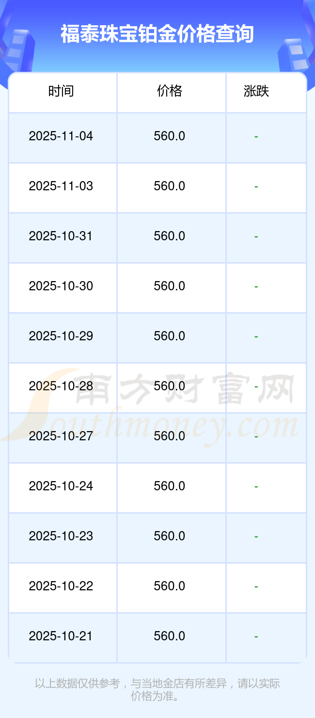 今日福泰珠宝铂金价格的价格是560.0元/克。
