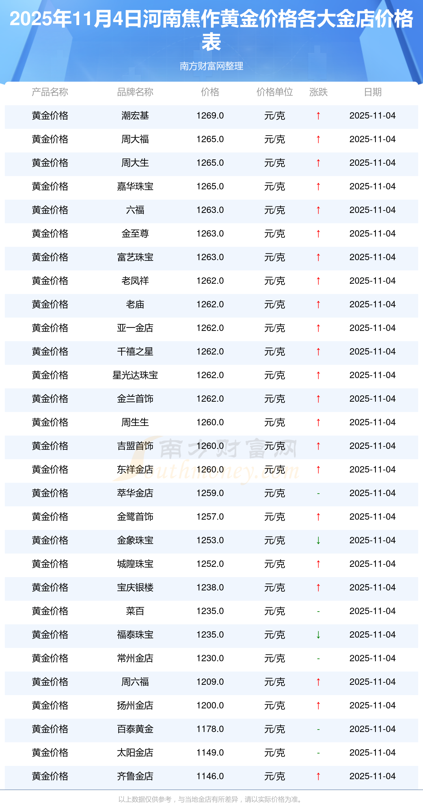 2025年11月4日河南焦作各大金店黄金价格最新价格:周大福1265.0元/克,周大福633.0元/克,周大福1265.0元/克,周大福44220.0,周大福18130.0,周大福39890.0,周大福1168.0元/克,老凤祥1262.0元/克,老凤祥560.0元/克,老凤祥1262.0元/克,周六福1209.0元/克。