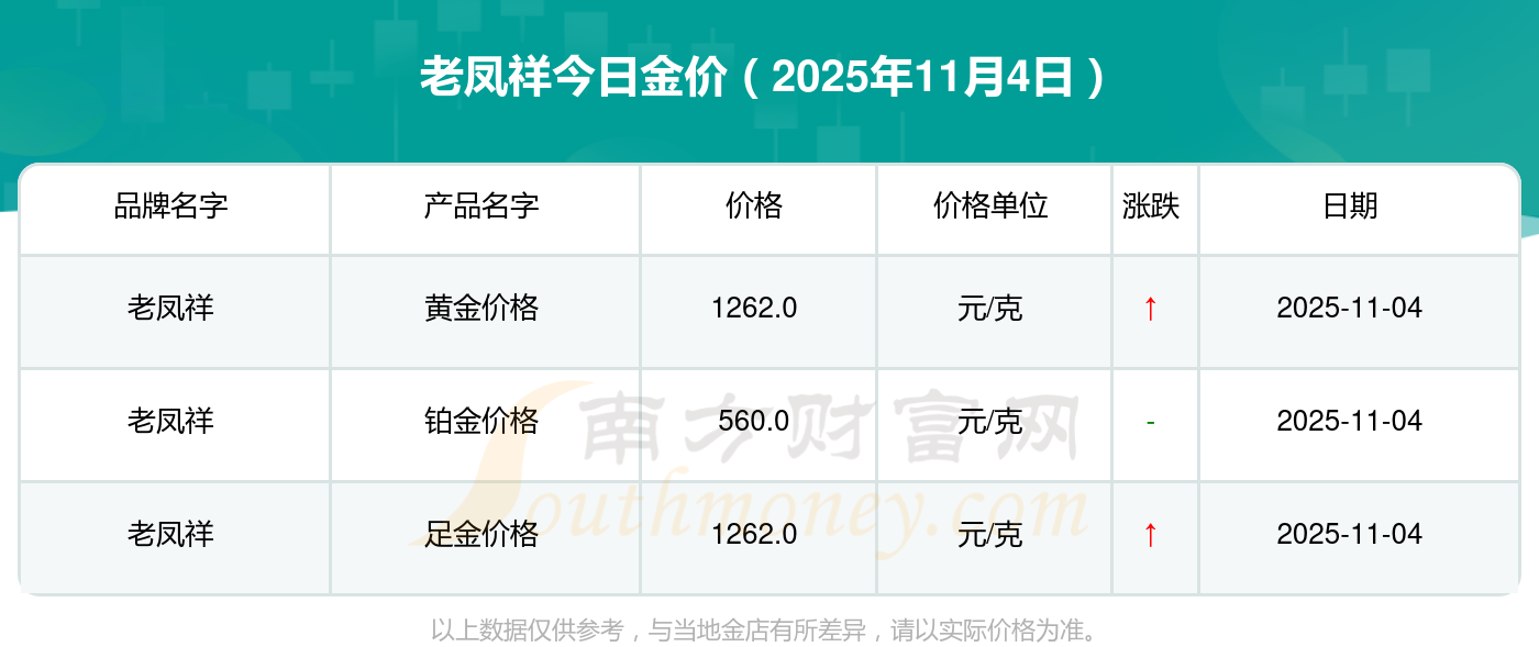 2025年11月4日,周大福、周大福、周大福、周大福、周大福、周大福、周大福、老凤祥、老凤祥、老凤祥、周六福等各大金店品牌黄金价格今日价格如下:周大福1265.0元/克、周大福633.0元/克、周大福1265.0元/克、周大福44220.0、周大福18130.0、周大福39890.0、周大福1168.0元/克、老凤祥1262.0元/克、老凤祥560.0元/克、老凤祥1262.0元/克、周六福1209.0元/克。
