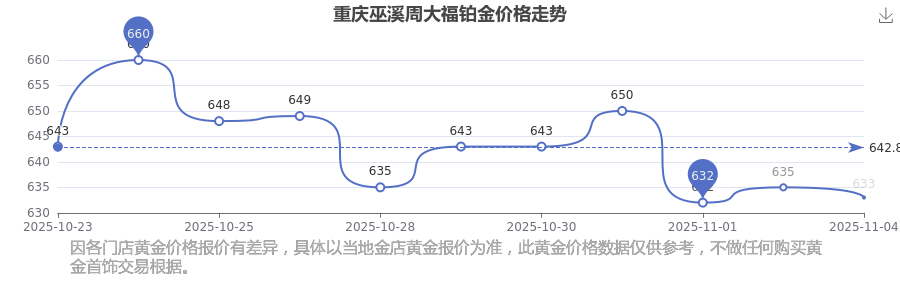 重庆巫溪周大福 2025年11月4日的铂金价格价位为 633.0元/克。