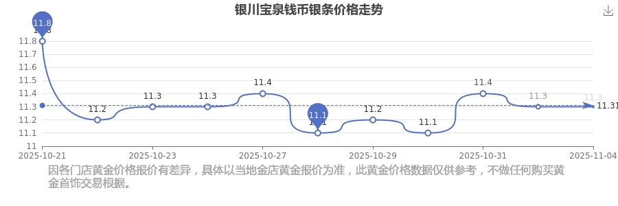 今日2025年11月4日,银川宝泉钱币银条价格为11.3元/克。