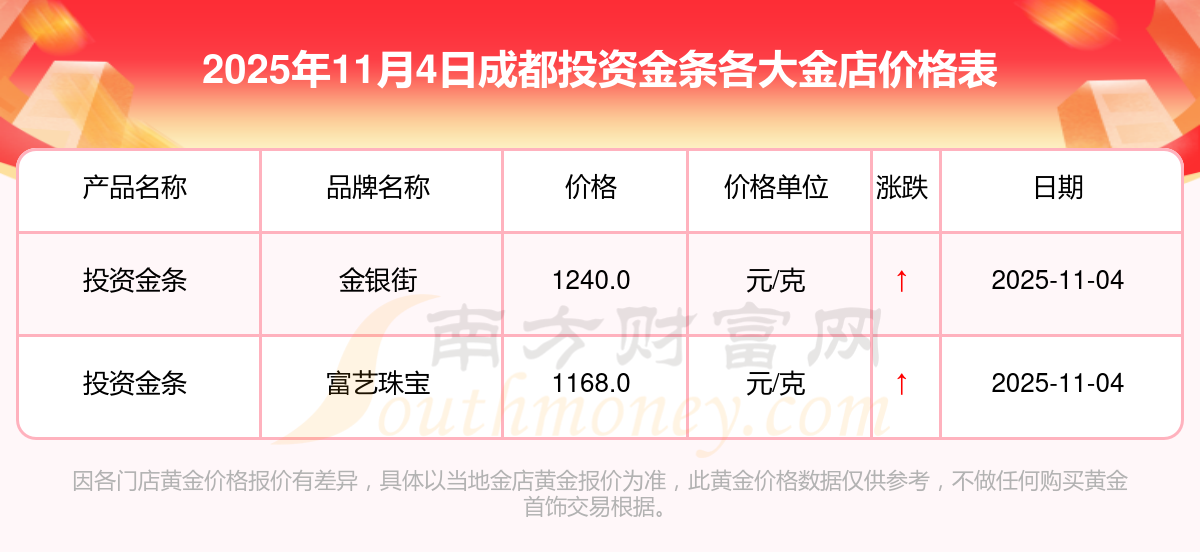 2025年11月4日成都各大金店投资金条最新价格查询来了:周大福1265.0元/克,周大福633.0元/克,周大福1265.0元/克,周大福44220.0,周大福18130.0,周大福39890.0,周大福1168.0元/克,老凤祥1262.0元/克,老凤祥560.0元/克,老凤祥1262.0元/克,周六福1209.0元/克。