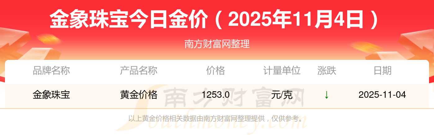 2025年11月4日,周大福、周大福、周大福、周大福、周大福、周大福、周大福、老凤祥、老凤祥、老凤祥、周六福等各大金店品牌黄金价格今日价格如下:周大福1265.0元/克、周大福633.0元/克、周大福1265.0元/克、周大福44220.0、周大福18130.0、周大福39890.0、周大福1168.0元/克、老凤祥1262.0元/克、老凤祥560.0元/克、老凤祥1262.0元/克、周六福1209.0元/克。