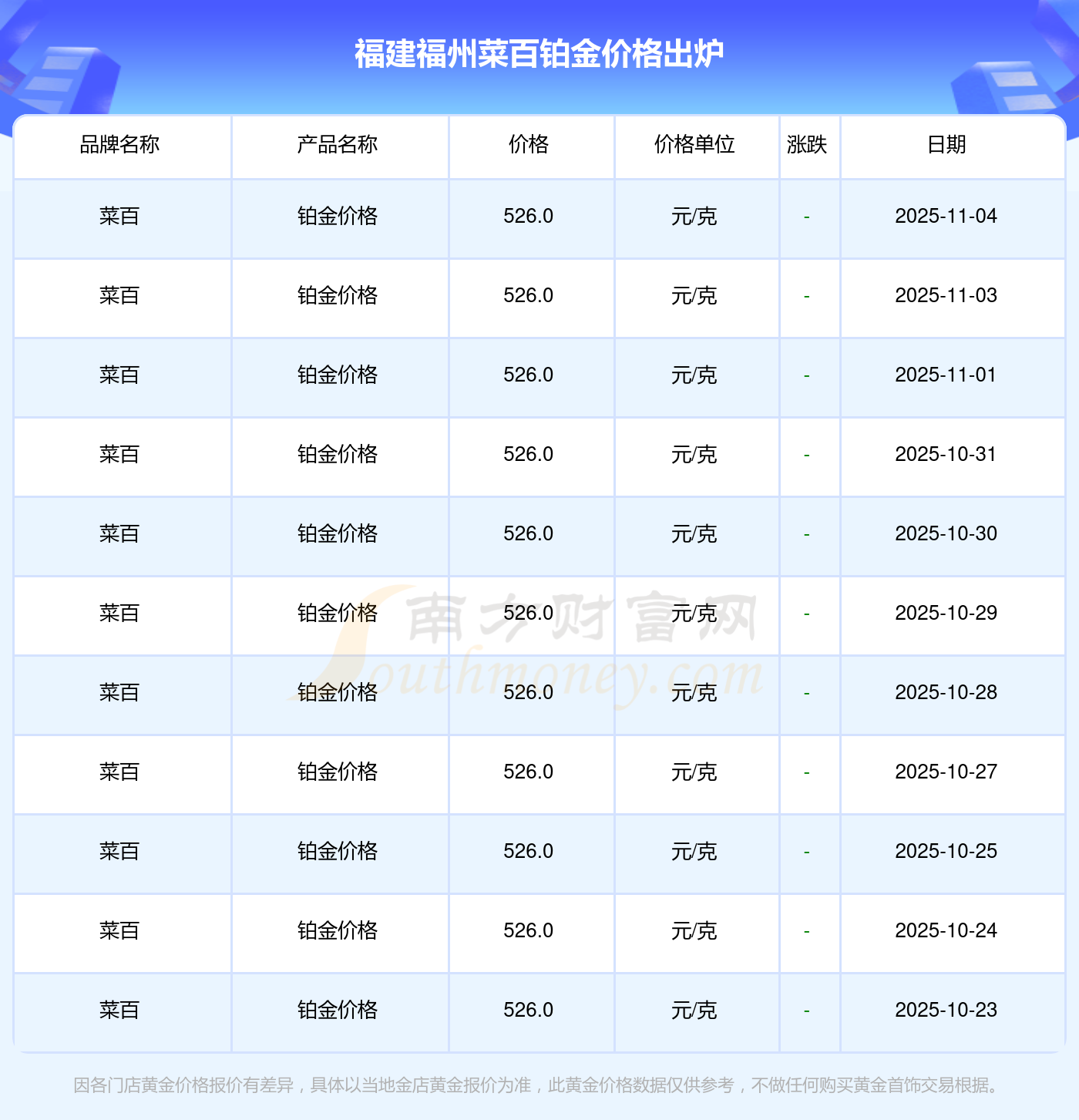 福建福州菜百铂金价格在 2025年11月4日为 526.0元/克。