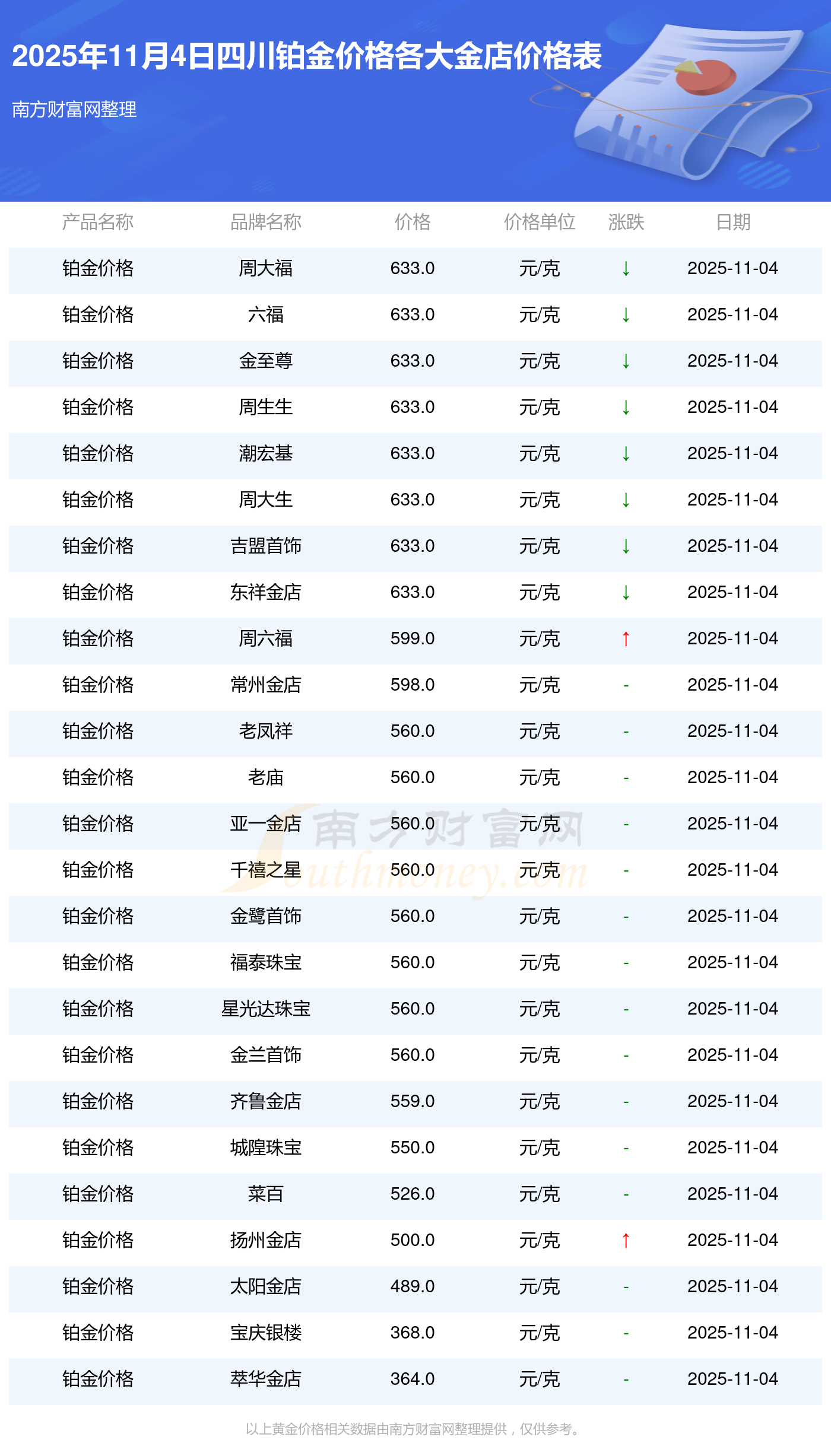 2025年11月4日四川周大福、周大福、周大福、周大福、周大福、周大福、周大福、老凤祥、老凤祥、老凤祥、周六福等各大金店品牌铂金价格最新价格行情来了,如下:周大福黄金价格1265.0元/克,周大福铂金价格633.0元/克,周大福饰品金价(内地)1265.0元/克,周大福黄金饰品(香港)44220.0,周大福铂金价格(香港)18130.0,周大福金条价格(香港)39890.0,周大福金条金价(内地)1168.0元/克,老凤祥黄金价格1262.0元/克,老凤祥铂金价格560.0元/克,老凤祥足金价格1262.0元/克,周六福黄金价格1209.0元/克。