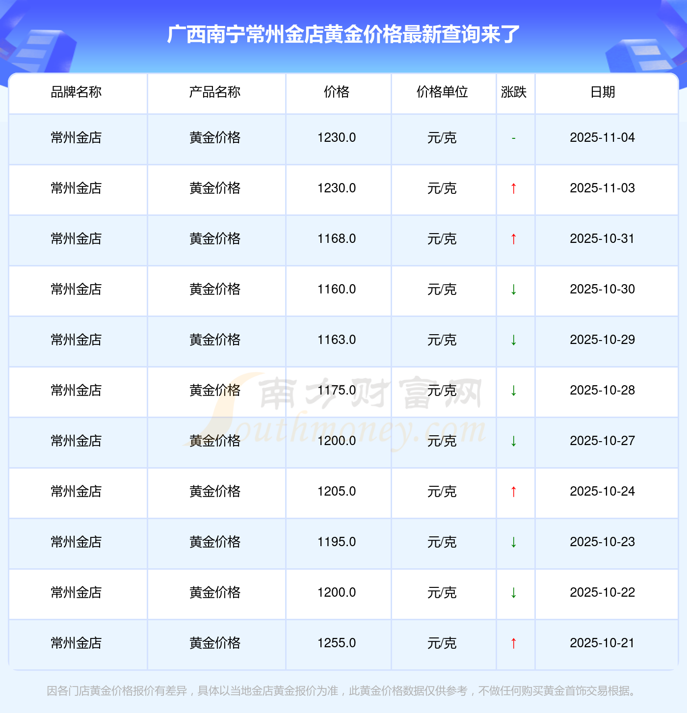 广西南宁常州金店的黄金价格在今日(2025年11月4日),每克售价为1230.0元/克。