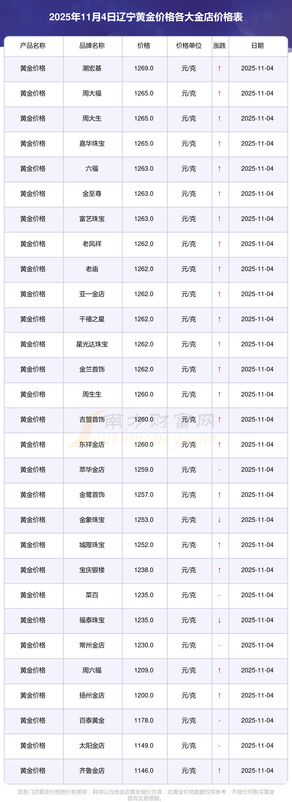 2025年11月4日辽宁周大福、周大福、周大福、周大福、周大福、周大福、周大福、老凤祥、老凤祥、老凤祥、周六福等各大金店品牌黄金价格最新价格如下:周大福黄金价格1265.0元/克,周大福铂金价格633.0元/克,周大福饰品金价(内地)1265.0元/克,周大福黄金饰品(香港)44220.0,周大福铂金价格(香港)18130.0,周大福金条价格(香港)39890.0,周大福金条金价(内地)1168.0元/克,老凤祥黄金价格1262.0元/克,老凤祥铂金价格560.0元/克,老凤祥足金价格1262.0元/克,周六福黄金价格1209.0元/克。