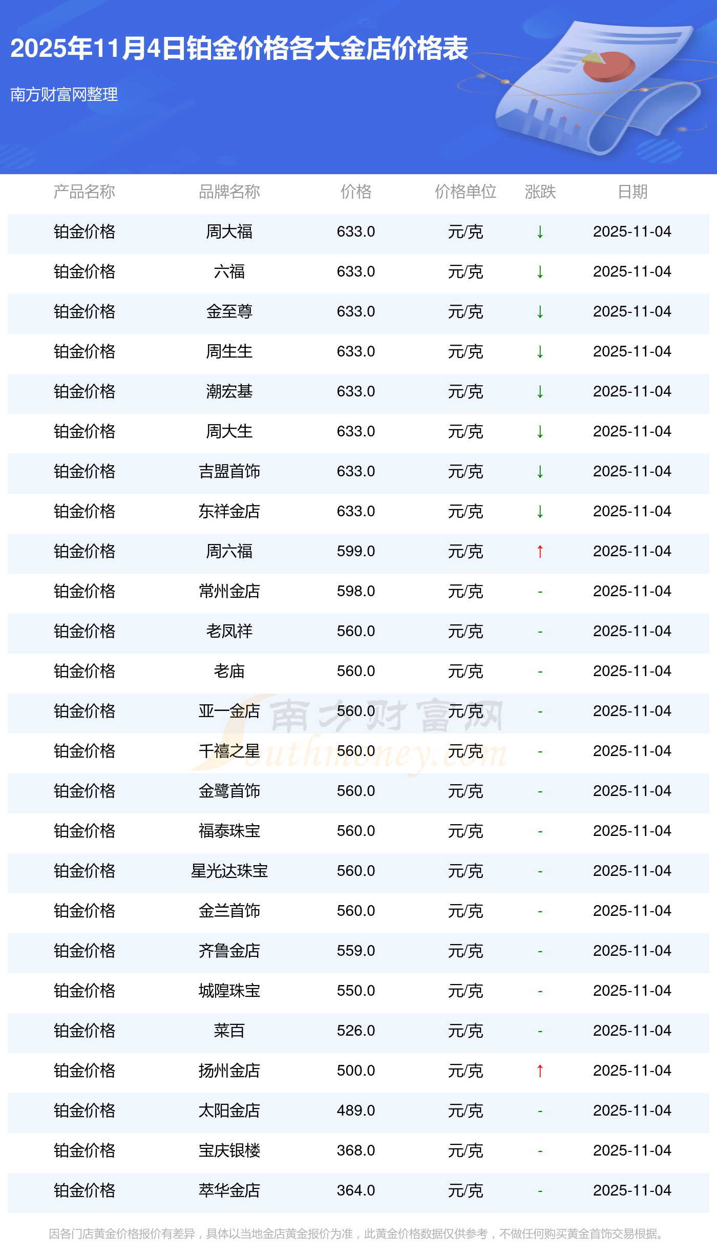 今天是2025年11月4日,周大福、周大福、周大福、周大福、周大福、周大福、周大福、老凤祥、老凤祥、老凤祥、周六福等各大金店品牌铂金价格最新价格如下:周大福1265.0元/克、周大福633.0元/克、周大福1265.0元/克、周大福44220.0、周大福18130.0、周大福39890.0、周大福1168.0元/克、老凤祥1262.0元/克、老凤祥560.0元/克、老凤祥1262.0元/克、周六福1209.0元/克。