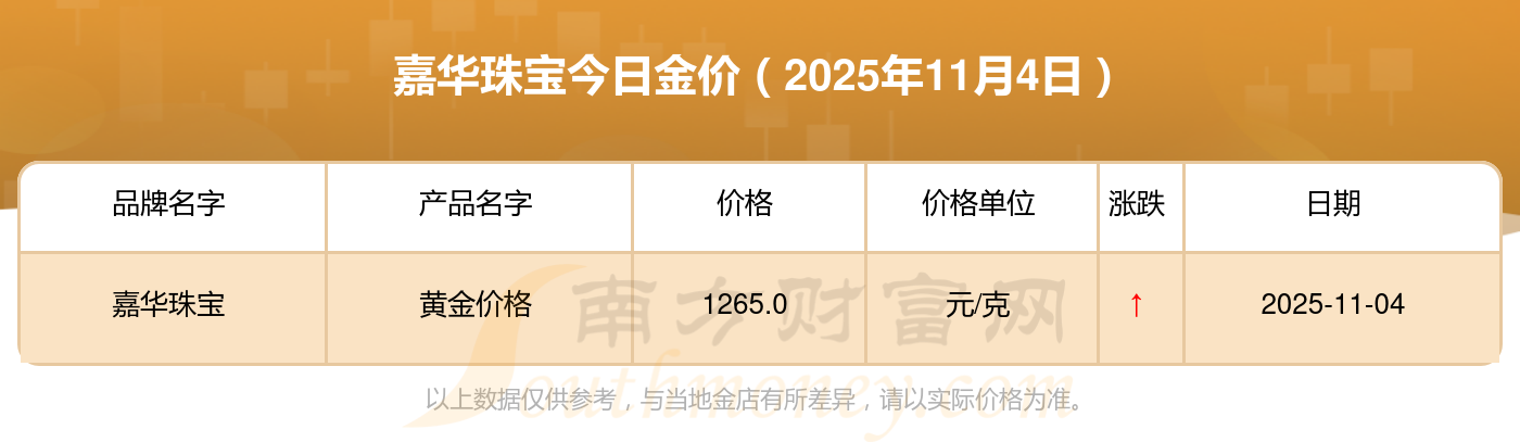 2025年11月4日周大福、周大福、周大福、周大福、周大福、周大福、周大福、老凤祥、老凤祥、老凤祥、周六福等各大金店品牌黄金价格最新价格如下:周大福黄金价格1265.0元/克,周大福铂金价格633.0元/克,周大福饰品金价(内地)1265.0元/克,周大福黄金饰品(香港)44220.0,周大福铂金价格(香港)18130.0,周大福金条价格(香港)39890.0,周大福金条金价(内地)1168.0元/克,老凤祥黄金价格1262.0元/克,老凤祥铂金价格560.0元/克,老凤祥足金价格1262.0元/克,周六福黄金价格1209.0元/克。