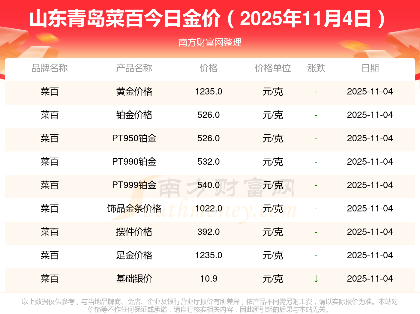 今日黄金售价是多少呢?此刻每克黄金价钱怎样?2025年11月4日山东青岛菜百一克黄金对应的价格是多少?黄金价格1265.0元/克,铂金价格633.0元/克,饰品金价(内地)1265.0元/克,黄金饰品(香港)44220.0,铂金价格(香港)18130.0,金条价格(香港)39890.0,金条金价(内地)1168.0元/克,黄金价格1262.0元/克,铂金价格560.0元/克,足金价格1262.0元/克,黄金价格1209.0元/克。