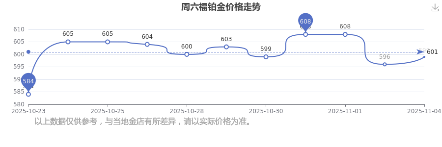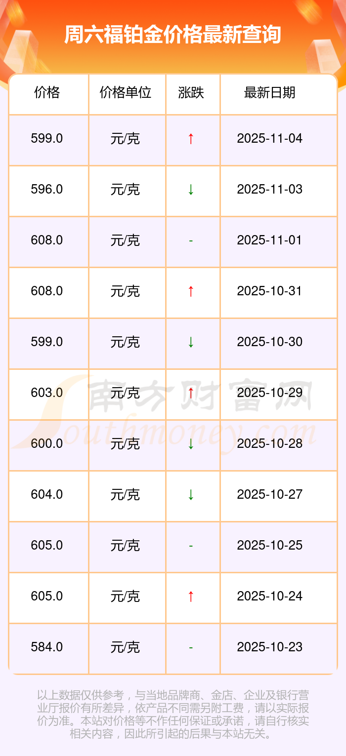 今日(2025年11月4日)周六福铂金价格是599.0元/克。