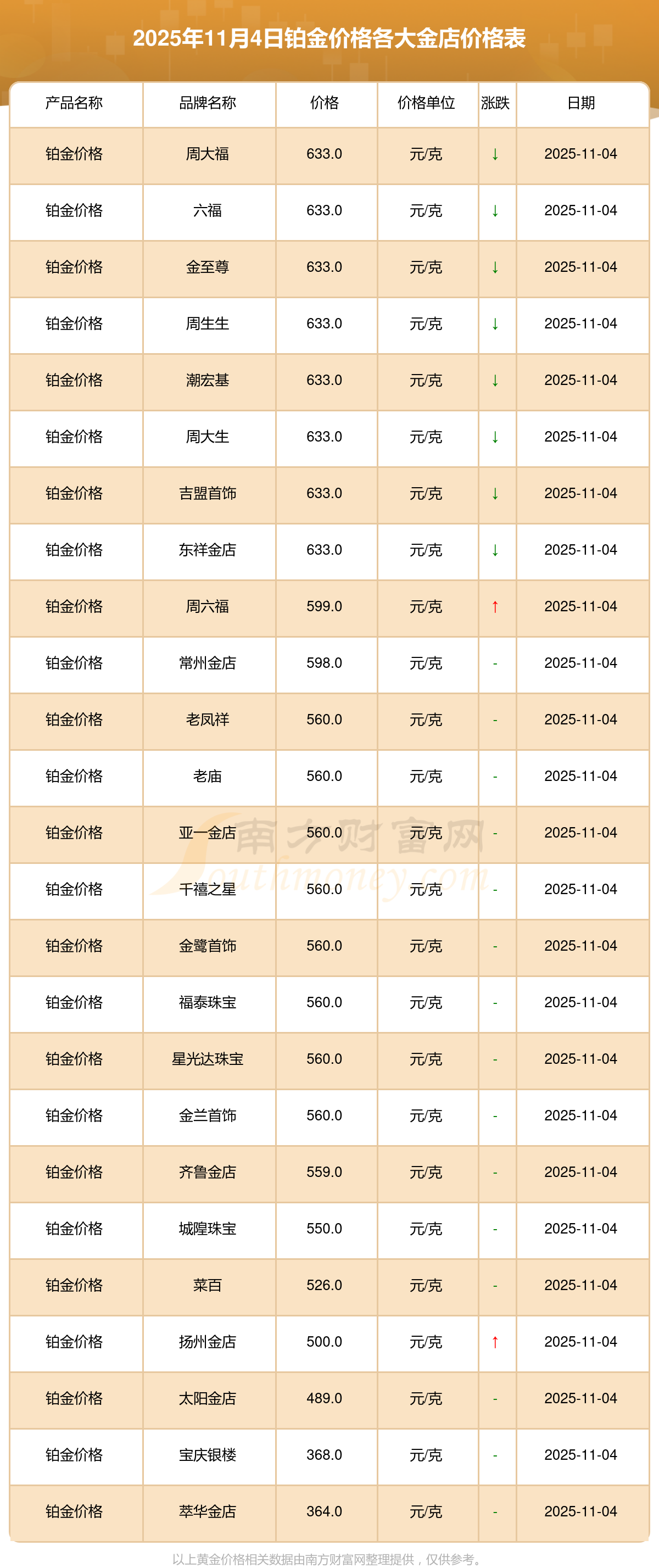 2025年11月4日各大金店铂金价格最新价格:周大福1265.0元/克,周大福633.0元/克,周大福1265.0元/克,周大福44220.0,周大福18130.0,周大福39890.0,周大福1168.0元/克,老凤祥1262.0元/克,老凤祥560.0元/克,老凤祥1262.0元/克,周六福1209.0元/克。