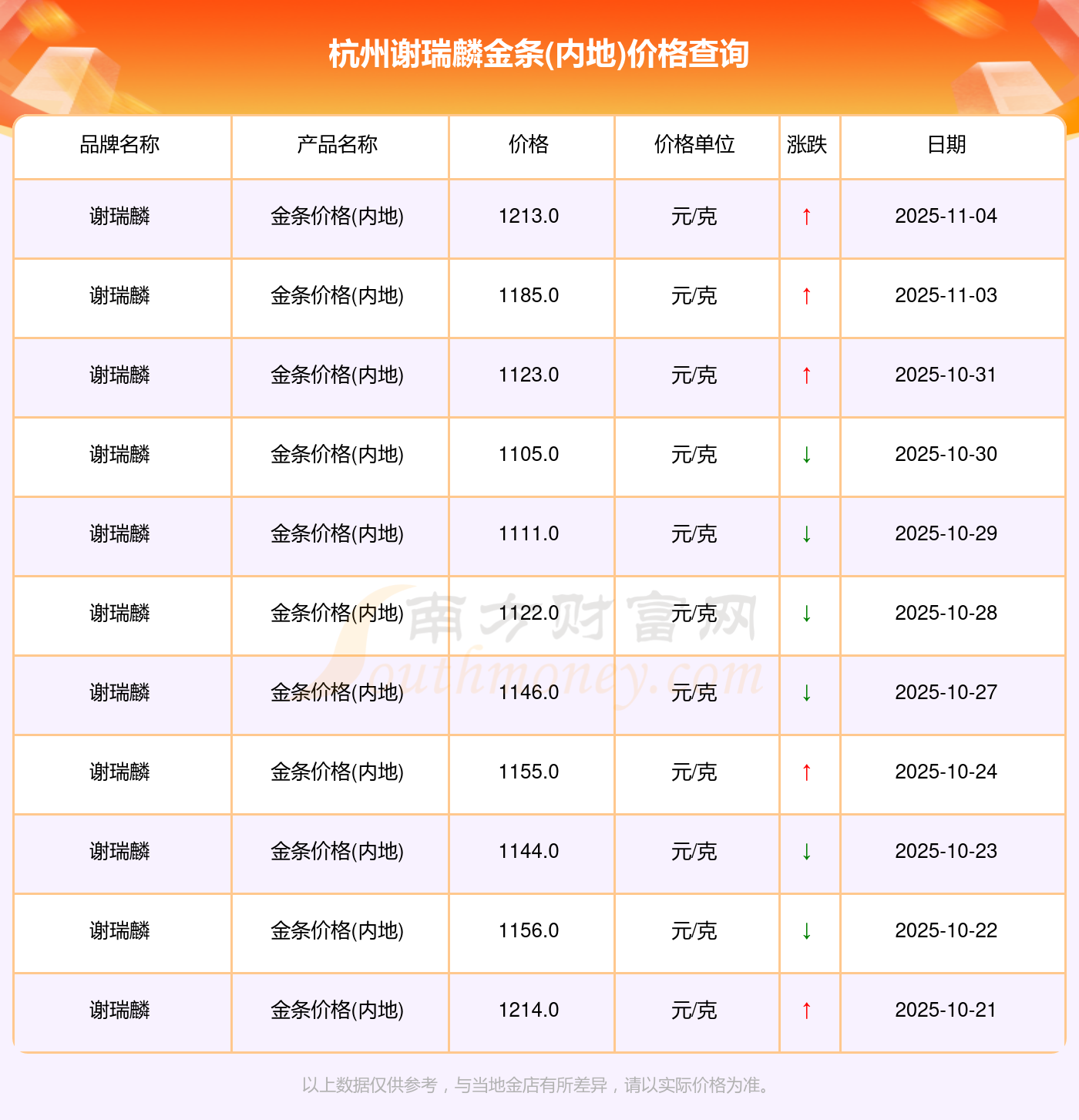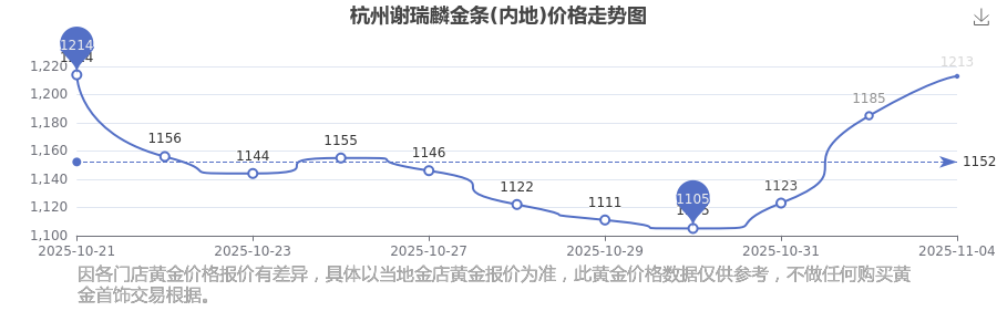 2025年11月4日杭州谢瑞麟金条(内地)价格是1213.0元/克。