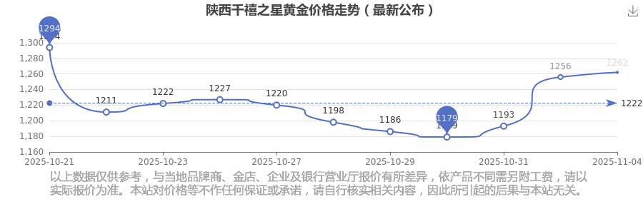 2025年11月4日,今日陕西千禧之星黄金价格:1262.0元/克。