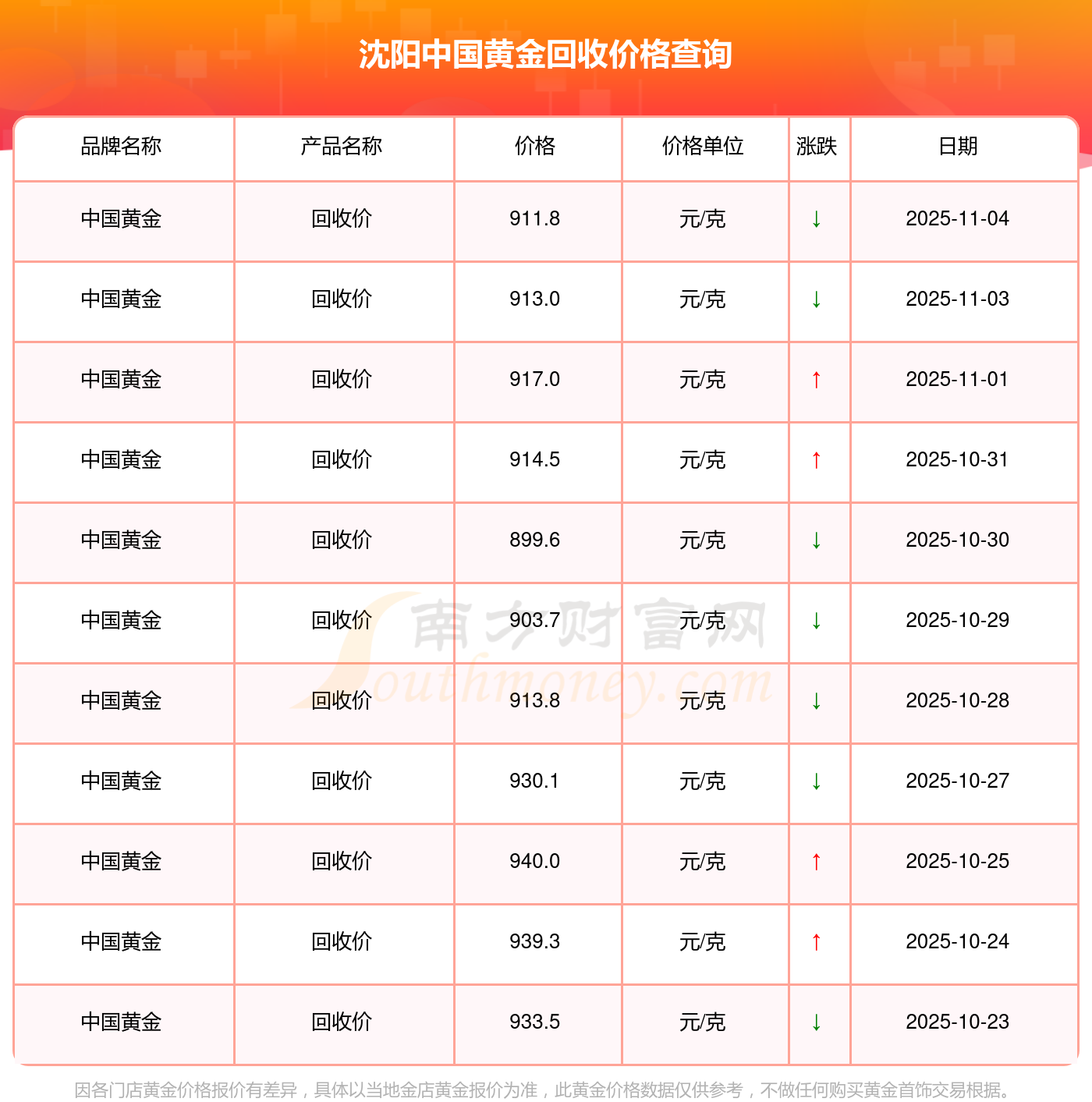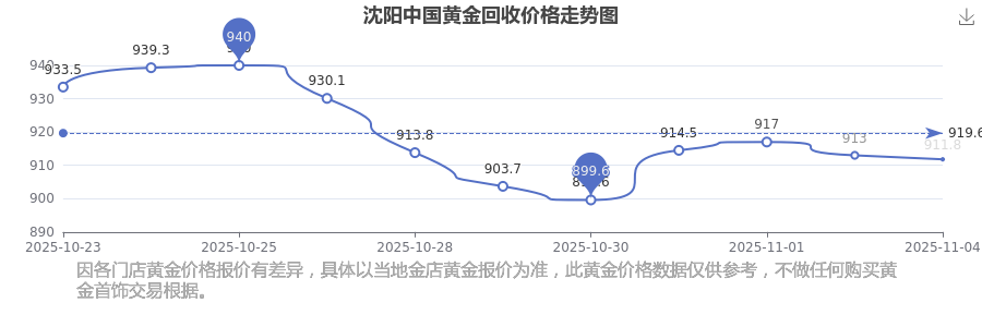 今日(2025年11月4日)沈阳中国黄金回收价格:911.8元/克。