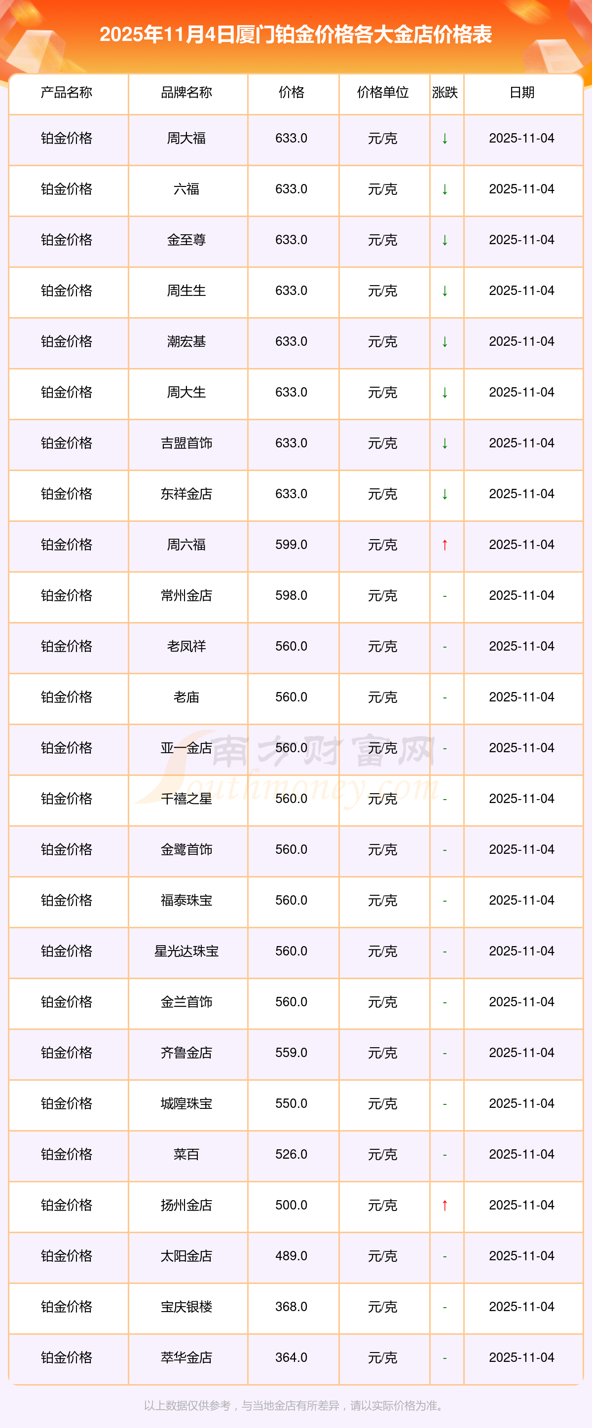 2025年11月4日,厦门周大福、周大福、周大福、周大福、周大福、周大福、周大福、老凤祥、老凤祥、老凤祥、周六福等各大金店品牌铂金价格今日价格如下:周大福1265.0元/克、周大福633.0元/克、周大福1265.0元/克、周大福44220.0、周大福18130.0、周大福39890.0、周大福1168.0元/克、老凤祥1262.0元/克、老凤祥560.0元/克、老凤祥1262.0元/克、周六福1209.0元/克。