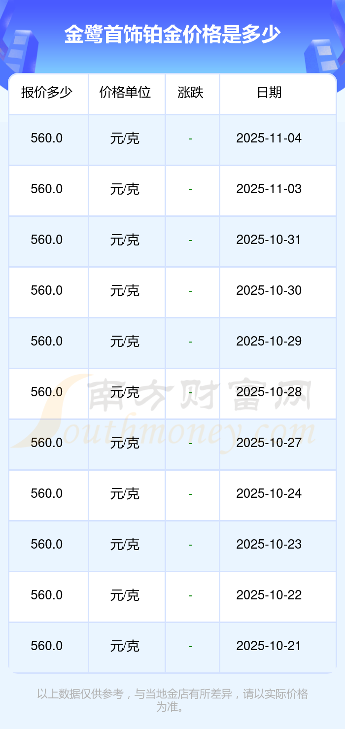2025年11月4日金鹭首饰铂金价格是560.0元/克。