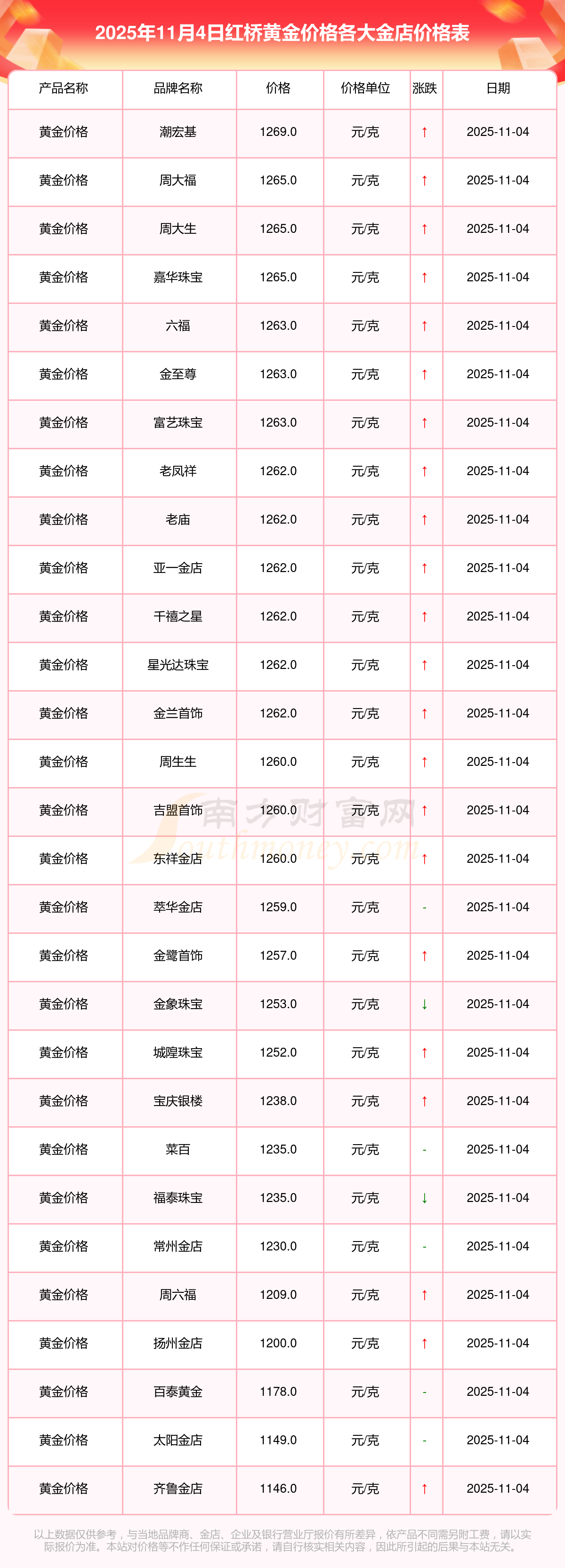 今天是2025年11月4日,红桥周大福、周大福、周大福、周大福、周大福、周大福、周大福、老凤祥、老凤祥、老凤祥、周六福等各大金店品牌黄金价格最新价格行情是这样的:周大福1265.0元/克、周大福633.0元/克、周大福1265.0元/克、周大福44220.0、周大福18130.0、周大福39890.0、周大福1168.0元/克、老凤祥1262.0元/克、老凤祥560.0元/克、老凤祥1262.0元/克、周六福1209.0元/克。