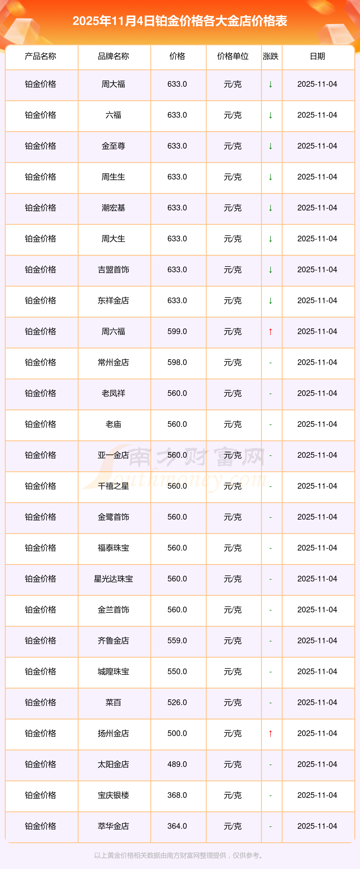 今天是2025年11月4日,周大福、周大福、周大福、周大福、周大福、周大福、周大福、老凤祥、老凤祥、老凤祥、周六福等各大金店品牌铂金价格最新价格如下:周大福1265.0元/克、周大福633.0元/克、周大福1265.0元/克、周大福44220.0、周大福18130.0、周大福39890.0、周大福1168.0元/克、老凤祥1262.0元/克、老凤祥560.0元/克、老凤祥1262.0元/克、周六福1209.0元/克。