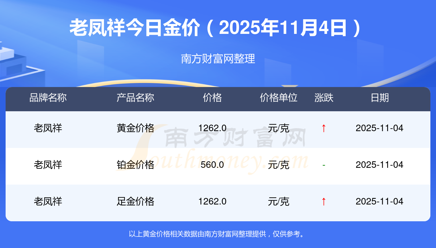 2025年11月4日周大福、周大福、周大福、周大福、周大福、周大福、周大福、老凤祥、老凤祥、老凤祥、周六福等各大金店品牌铂金价格最新价格如下:周大福黄金价格1265.0元/克,周大福铂金价格633.0元/克,周大福饰品金价(内地)1265.0元/克,周大福黄金饰品(香港)44220.0,周大福铂金价格(香港)18130.0,周大福金条价格(香港)39890.0,周大福金条金价(内地)1168.0元/克,老凤祥黄金价格1262.0元/克,老凤祥铂金价格560.0元/克,老凤祥足金价格1262.0元/克,周六福黄金价格1209.0元/克。