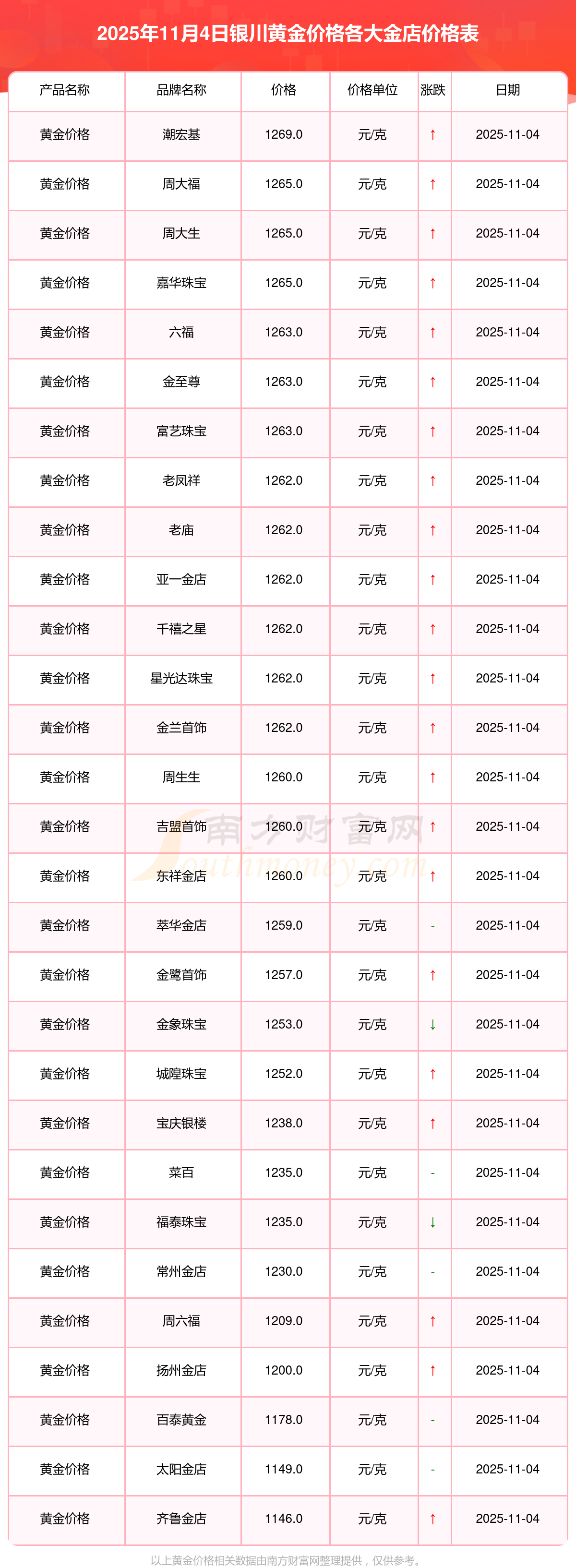 一、银川各金店黄金价格表最新是多少钱,黄金价格今天多少一克,今日最新的黄金克价列表吗