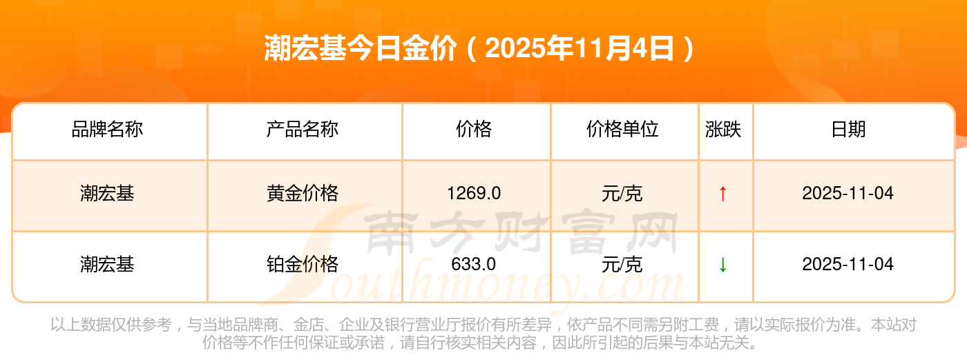 2025年11月4日各大金店黄金价格最新价格:周大福1265.0元/克,周大福633.0元/克,周大福1265.0元/克,周大福44220.0,周大福18130.0,周大福39890.0,周大福1168.0元/克,老凤祥1262.0元/克,老凤祥560.0元/克,老凤祥1262.0元/克,周六福1209.0元/克。