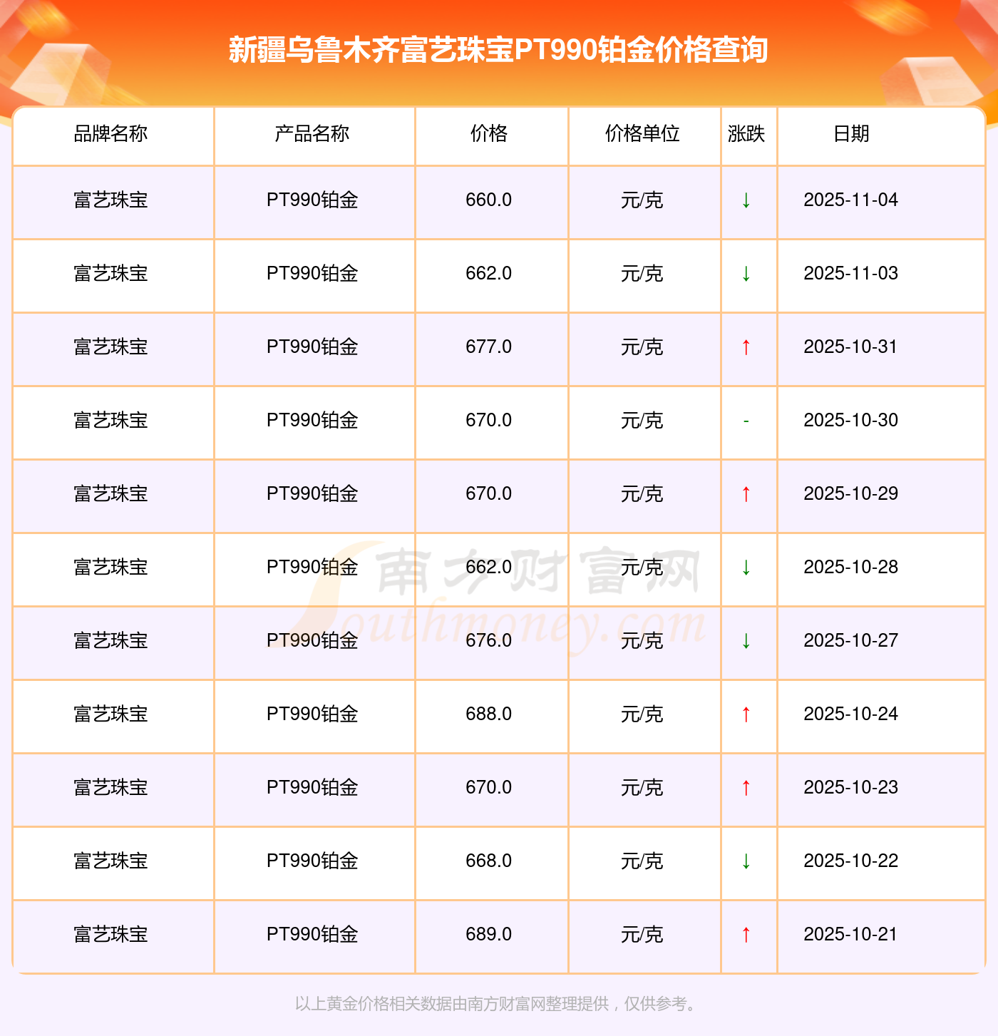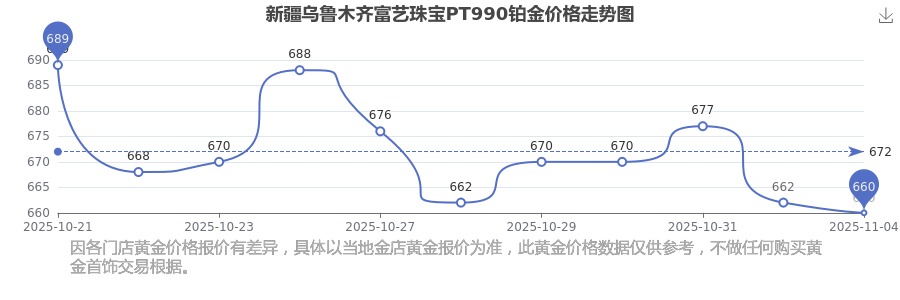 今日新疆乌鲁木齐富艺珠宝PT990铂金价格:660.0元/克。