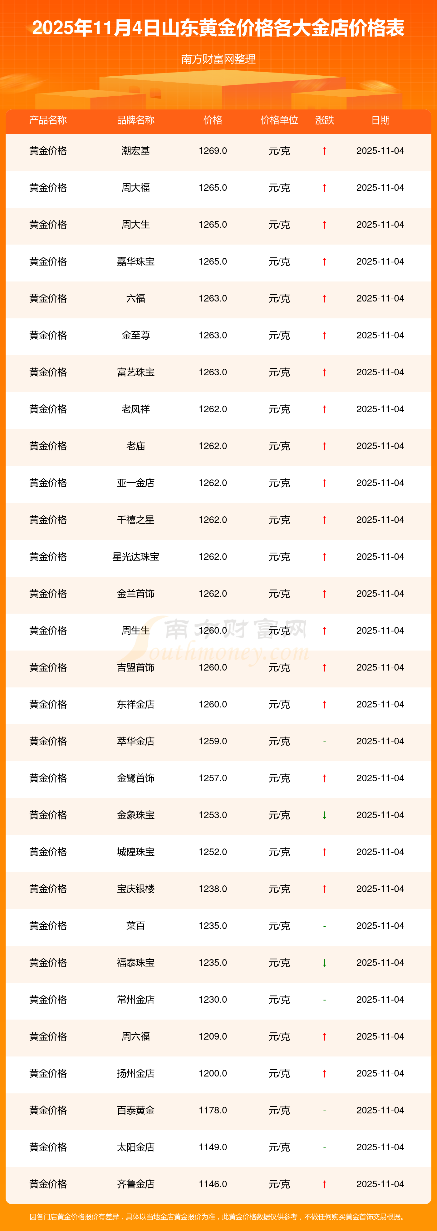 目前,山东黄金价格报价区间在1269.0元/克和1146.0元/克之间。最高的为潮宏基,报价1269.0元/克,最低的为齐鲁金店,报价1146.0元/克。今日黄金价格高低差为123元/克。