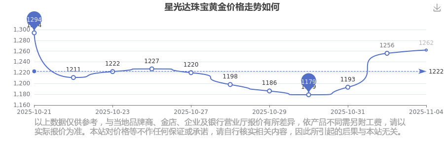 想了解今日黄金价格,现在每克黄金的价格是多少呢?黄金是一种优良的导电导热材料,具有良好的导热特性。黄金常用于电子工业中的特殊电路设计,因其化学稳定性高、抗氧化性强,可制作高精度电子元件。今日(2025年11月4日)星光达珠宝黄金价格为1262.0元/克。