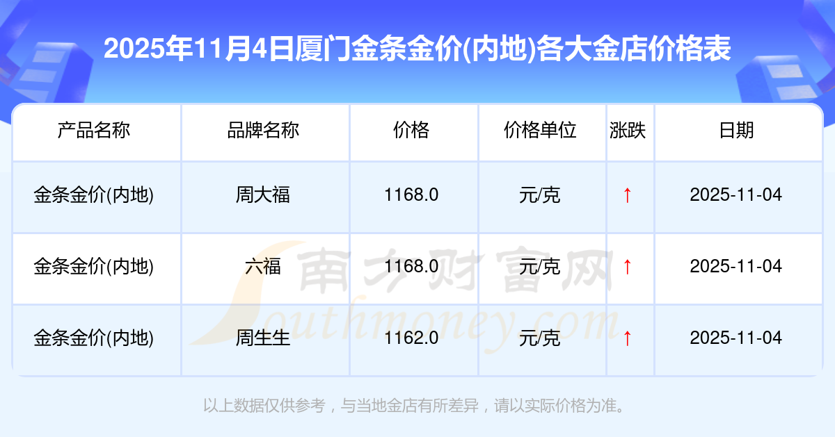 2025年11月4日厦门各大金店金条金价(内地)最新价格查询来了:周大福1265.0元/克,周大福633.0元/克,周大福1265.0元/克,周大福44220.0,周大福18130.0,周大福39890.0,周大福1168.0元/克,老凤祥1262.0元/克,老凤祥560.0元/克,老凤祥1262.0元/克,周六福1209.0元/克。