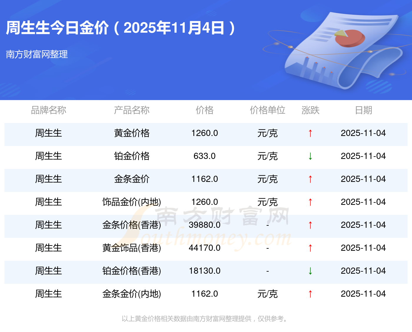 2025年11月4日周大福、周大福、周大福、周大福、周大福、周大福、周大福、老凤祥、老凤祥、老凤祥、周六福等各大金店品牌铂金价格最新价格如下:周大福黄金价格1265.0元/克,周大福铂金价格633.0元/克,周大福饰品金价(内地)1265.0元/克,周大福黄金饰品(香港)44220.0,周大福铂金价格(香港)18130.0,周大福金条价格(香港)39890.0,周大福金条金价(内地)1168.0元/克,老凤祥黄金价格1262.0元/克,老凤祥铂金价格560.0元/克,老凤祥足金价格1262.0元/克,周六福黄金价格1209.0元/克。