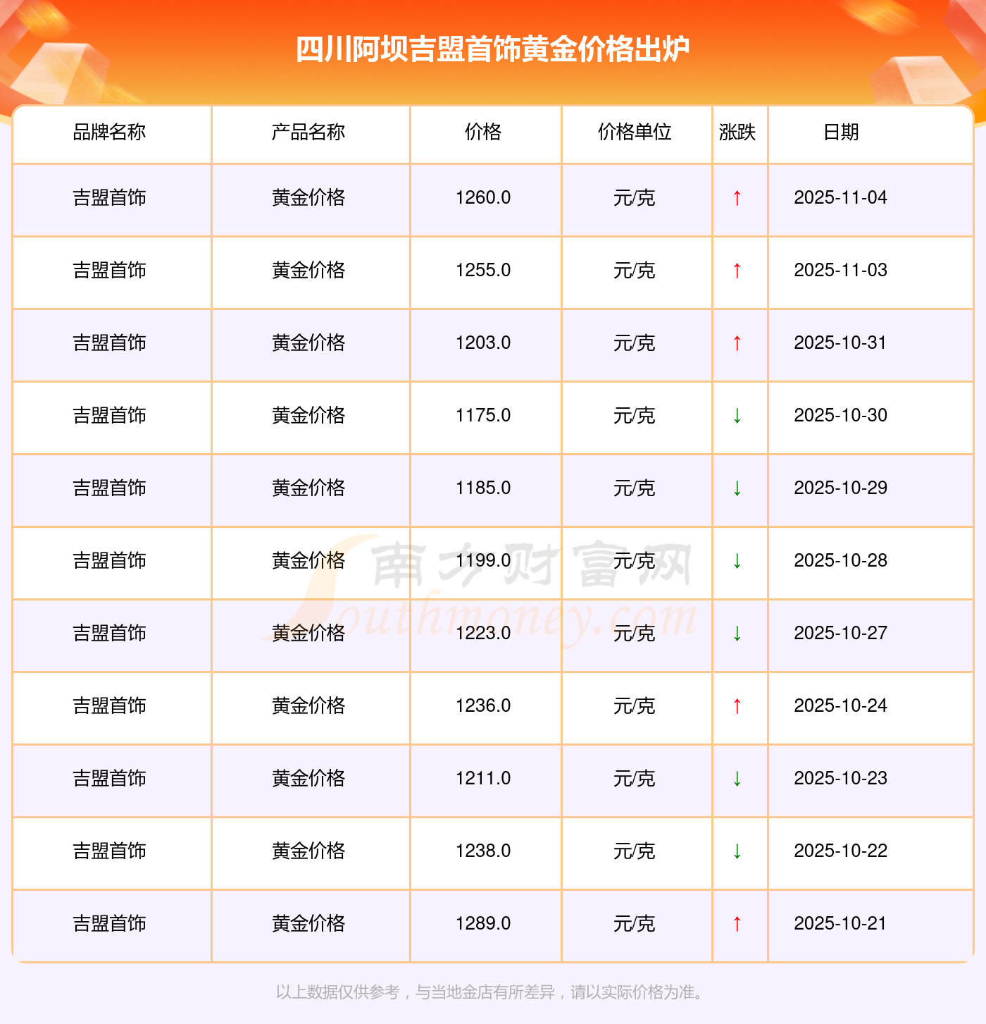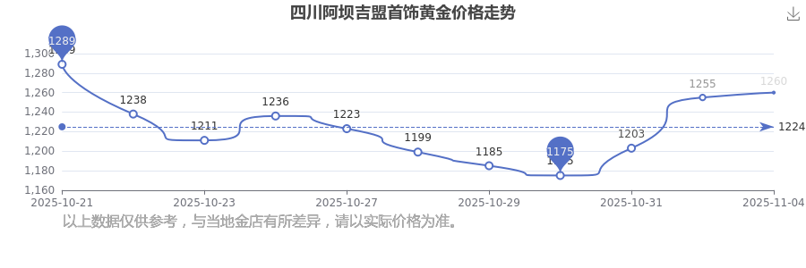 今日(2025年11月4日)四川阿坝吉盟首饰黄金价格是1260.0元/克。