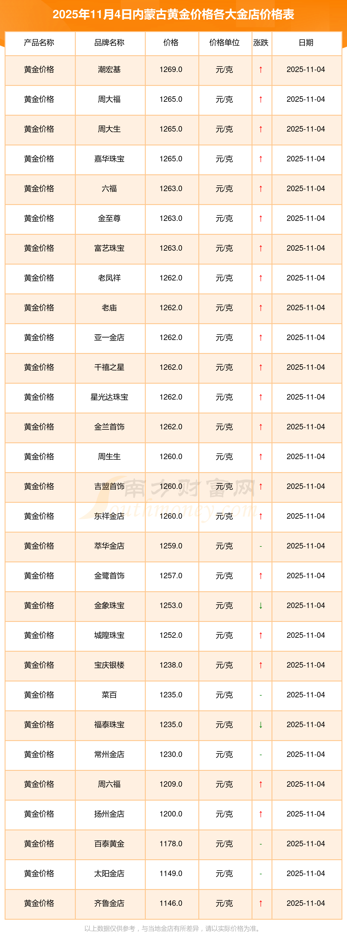 2025年11月4日内蒙古周大福、周大福、周大福、周大福、周大福、周大福、周大福、老凤祥、老凤祥、老凤祥、周六福等各大金店品牌黄金价格最新价格如下:周大福黄金价格1265.0元/克,周大福铂金价格633.0元/克,周大福饰品金价(内地)1265.0元/克,周大福黄金饰品(香港)44220.0,周大福铂金价格(香港)18130.0,周大福金条价格(香港)39890.0,周大福金条金价(内地)1168.0元/克,老凤祥黄金价格1262.0元/克,老凤祥铂金价格560.0元/克,老凤祥足金价格1262.0元/克,周六福黄金价格1209.0元/克。