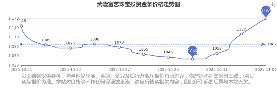 1168.0元/克的投资金条价格,是武隆富艺珠宝在 2025年11月4日给出的。