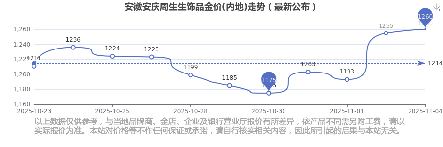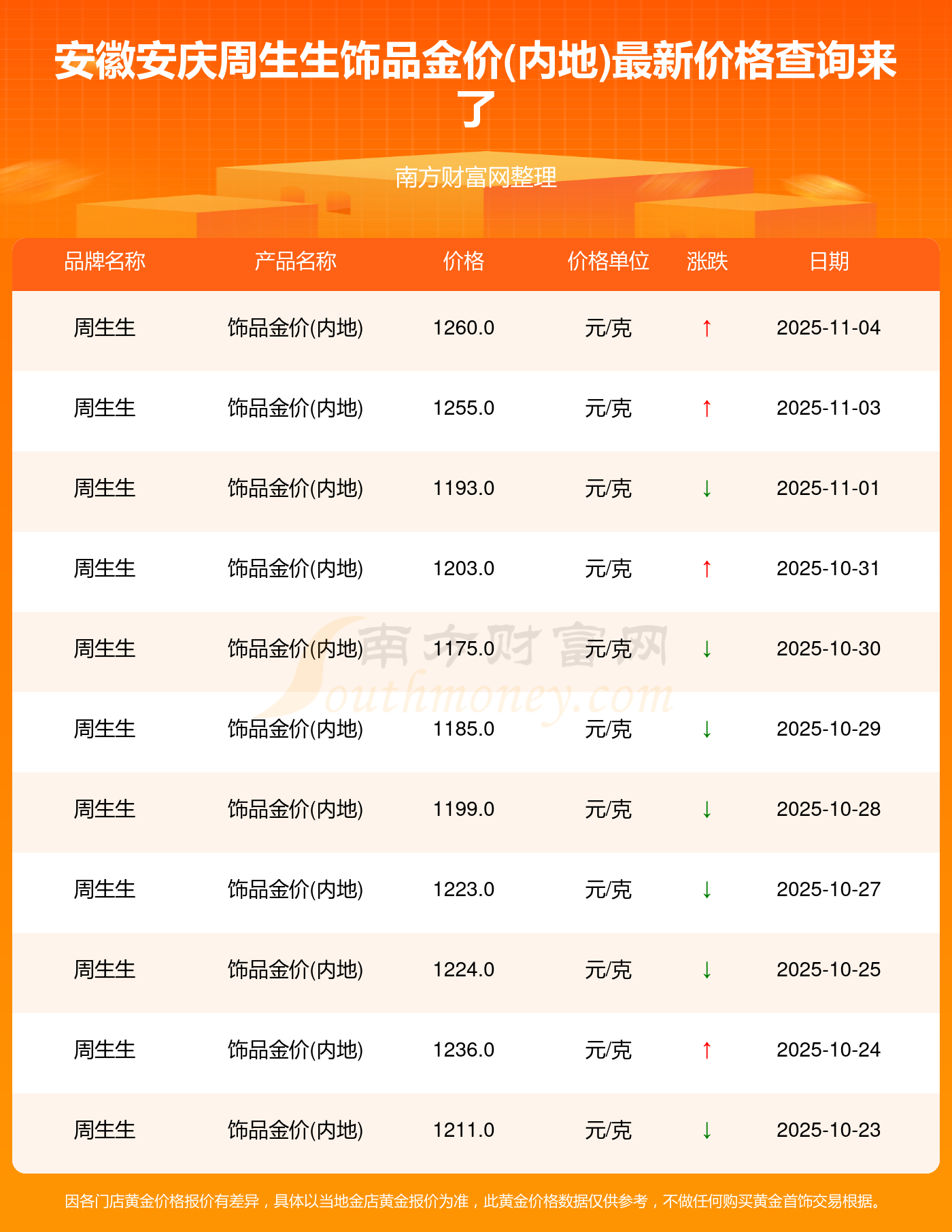 今日安徽安庆周生生饰品金价(内地)最新价格是1260.0元/克。