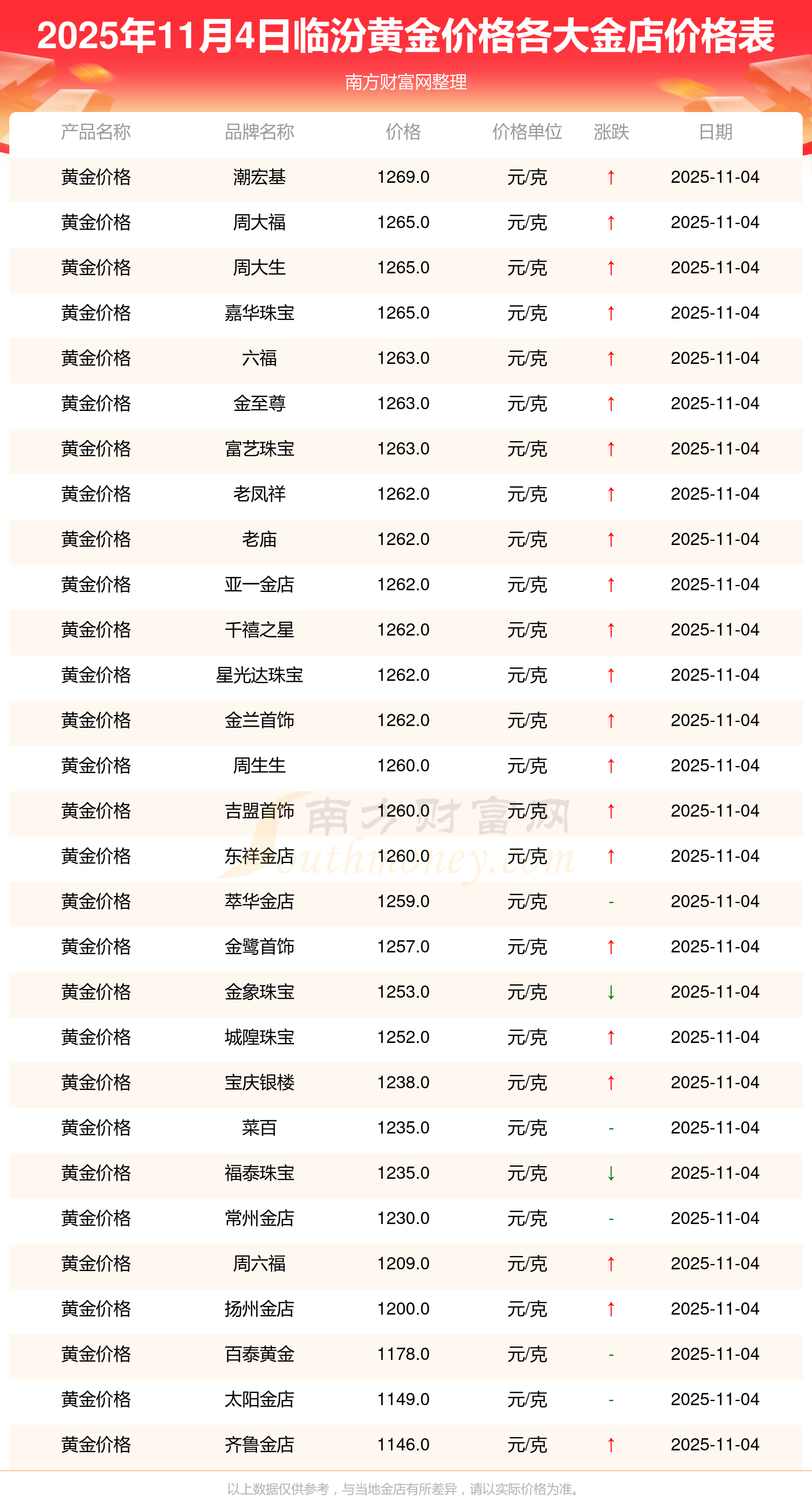 一、2025年11月4日,临汾周大福、周大福、周大福、周大福、周大福、周大福、周大福、老凤祥、老凤祥、老凤祥、周六福等各大金店品牌黄金价格今日价格如下:周大福1265.0元/克、周大福633.0元/克、周大福1265.0元/克、周大福44220.0、周大福18130.0、周大福39890.0、周大福1168.0元/克、老凤祥1262.0元/克、老凤祥560.0元/克、老凤祥1262.0元/克、周六福1209.0元/克。