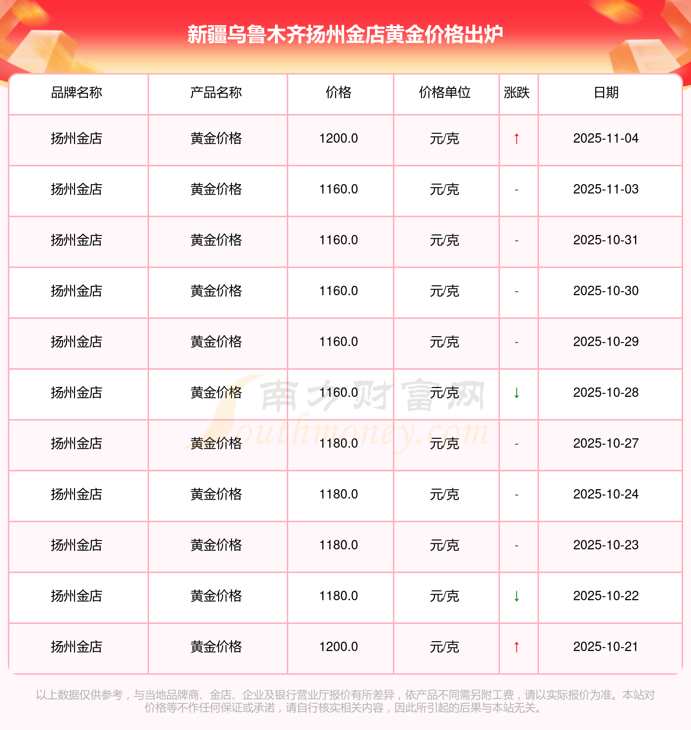 今日新疆乌鲁木齐扬州金店黄金价格公布黄金每克价值多少钱新疆乌鲁木齐扬州金店 2025年11月4日的黄金价格价位为 1200.0元/克。