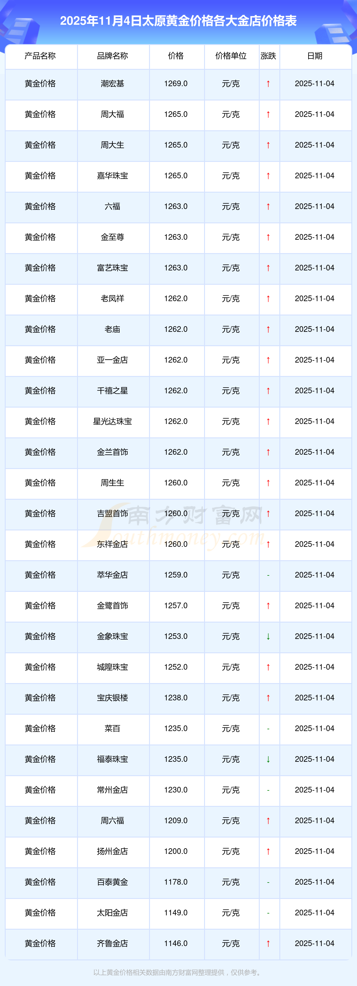 今天是2025年11月4日,太原周大福、周大福、周大福、周大福、周大福、周大福、周大福、老凤祥、老凤祥、老凤祥、周六福等各大金店品牌黄金价格最新价格行情是这样的:周大福1265.0元/克、周大福633.0元/克、周大福1265.0元/克、周大福44220.0、周大福18130.0、周大福39890.0、周大福1168.0元/克、老凤祥1262.0元/克、老凤祥560.0元/克、老凤祥1262.0元/克、周六福1209.0元/克。