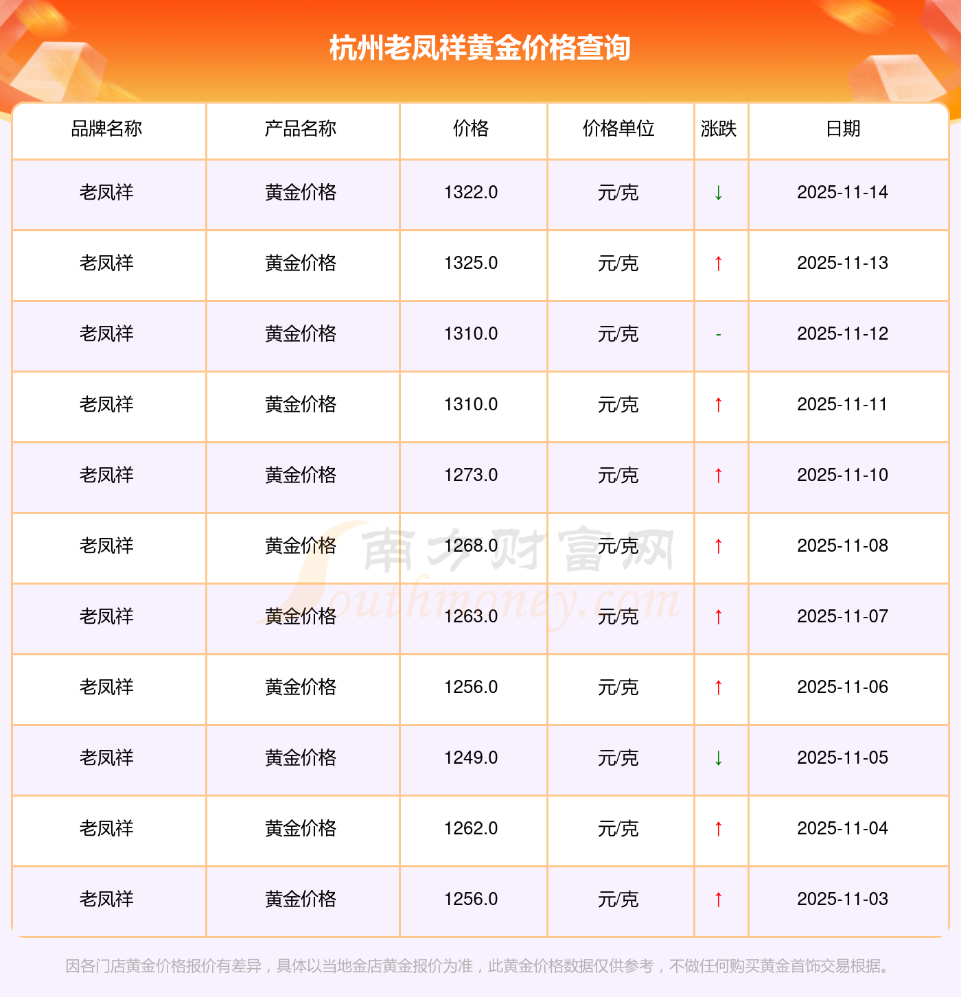 (2025年11月14日)今日杭州老凤祥黄金价格是1322.0元/克。