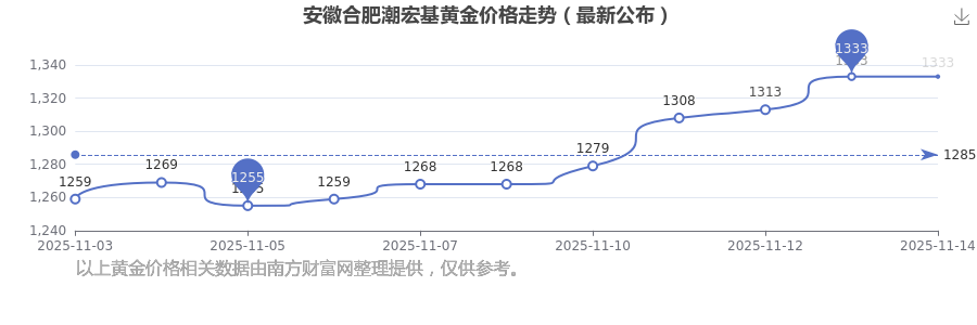 今日2025年11月14日,安徽合肥潮宏基黄金价格为1333.0元/克。