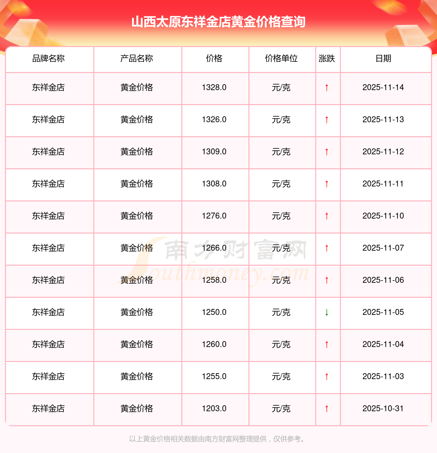 山西太原东祥金店 2025年11月14日的黄金价格价位为 1328.0元/克。