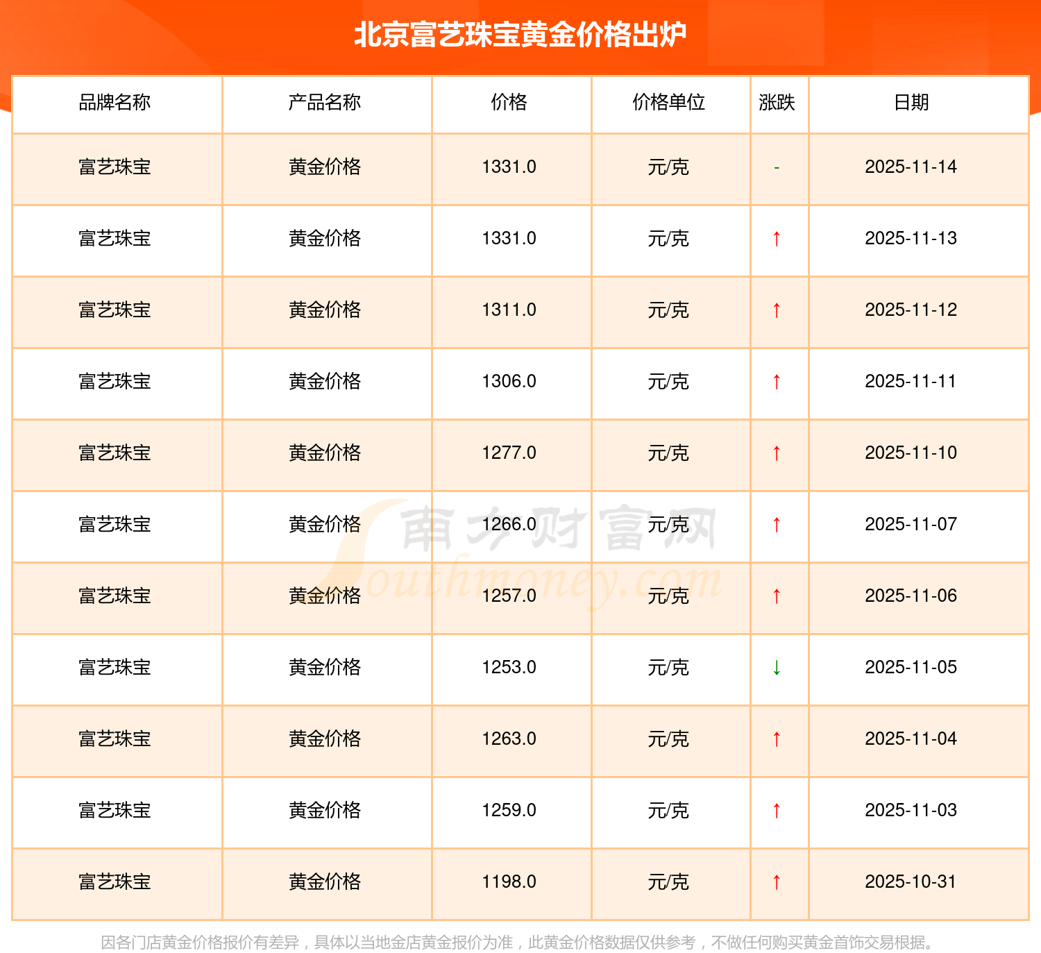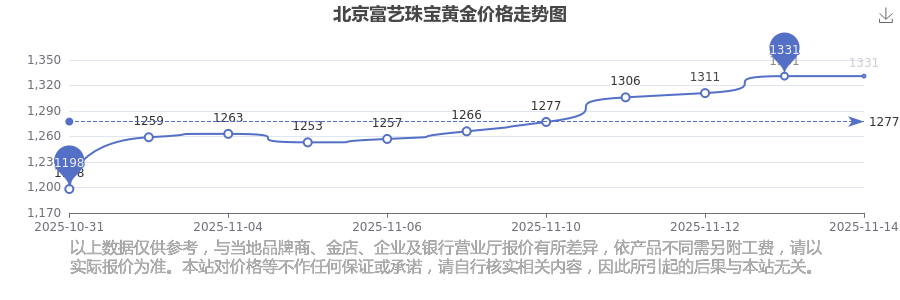 今日北京富艺珠宝黄金价格最新价格是1331.0元/克。