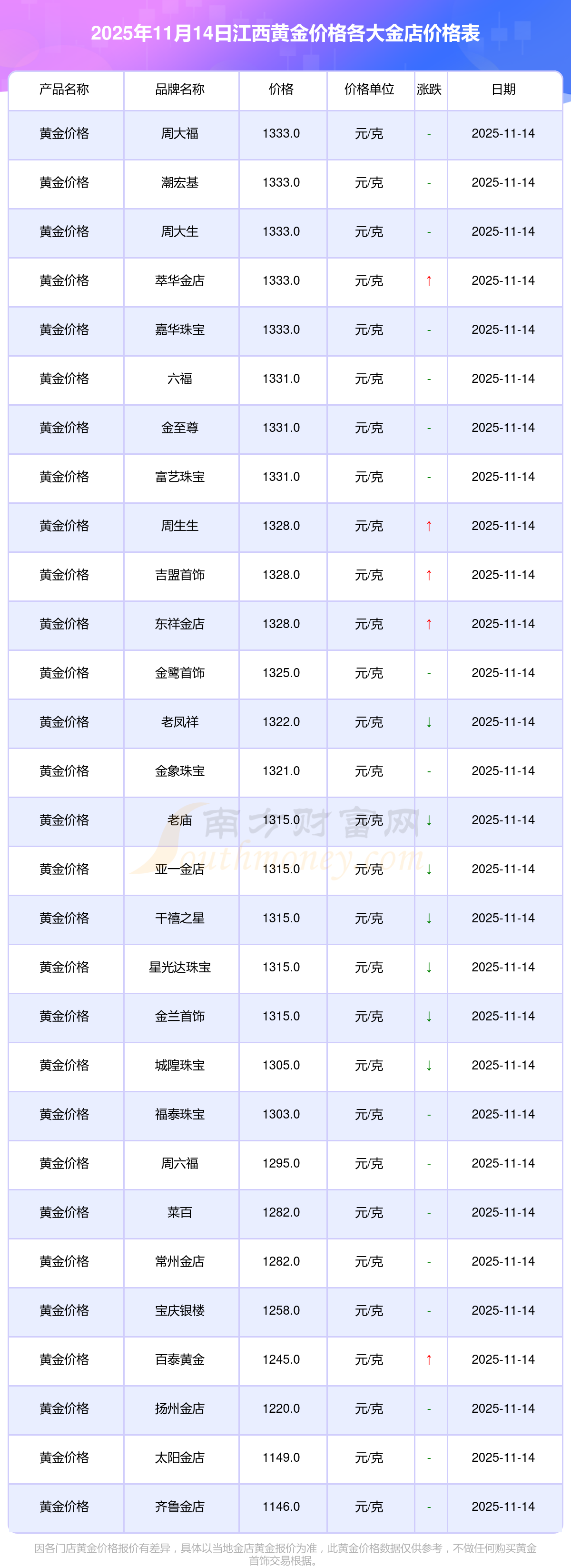 2025年11月14日江西各大金店黄金价格最新价格:周大福1333.0元/克,周大福646.0元/克,周大福1333.0元/克,周大福46320.0,周大福18410.0,周大福41780.0,周大福1167.0元/克,老凤祥1322.0元/克,老凤祥600.0元/克,老凤祥1322.0元/克,周六福1295.0元/克。