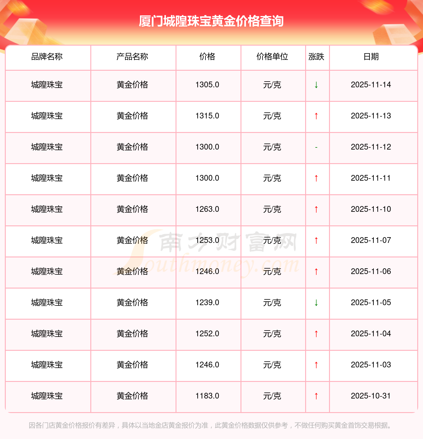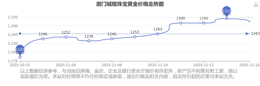 厦门城隍珠宝现在黄金价格每克多少?想了解今天黄金一克的行情价是多少钱?今日厦门城隍珠宝黄金价格查询,今日(2025年11月14日),厦门城隍珠宝黄金价格的定价为 1305.0元/克。